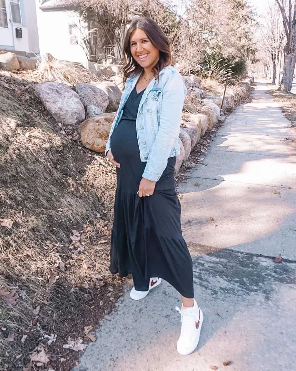 This effortlessly chic combination of a black maxi dress paired with a light wash denim jacket is a maternity style win. The flowing maxi dress accommodates a growing bump while providing comfort and elegance.