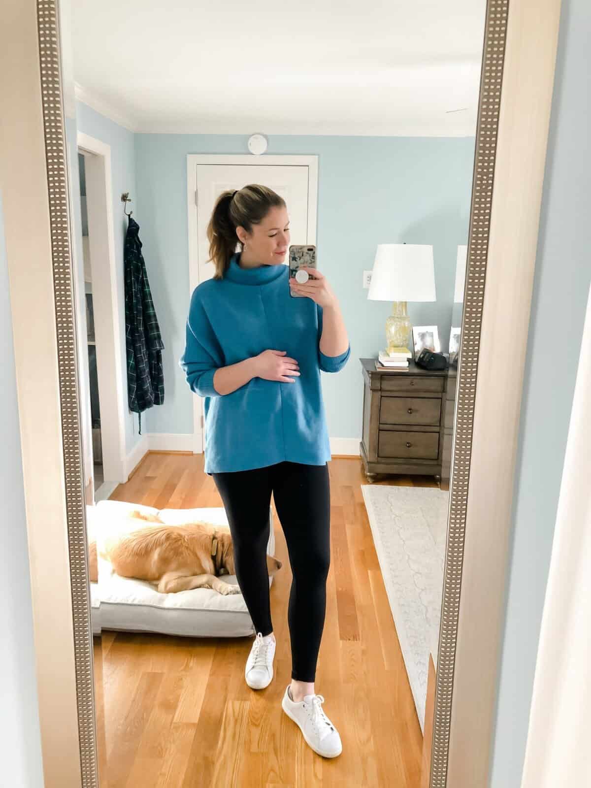 This comfortable yet stylish maternity outfit perfectly balances ease and elegance. The oversized teal turtleneck sweater drapes beautifully over the baby bump, providing ample room for growth while maintaining a chic silhouette.