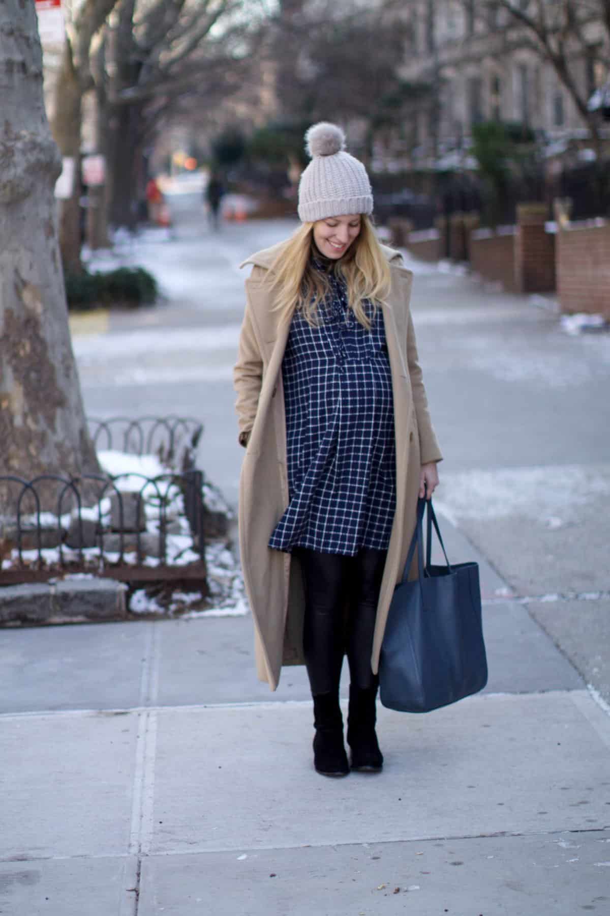 A chic camel coat adds a touch of sophistication while providing extra warmth. The look is completed with a cute knit beanie, showcasing how accessories can elevate a maternity outfit.