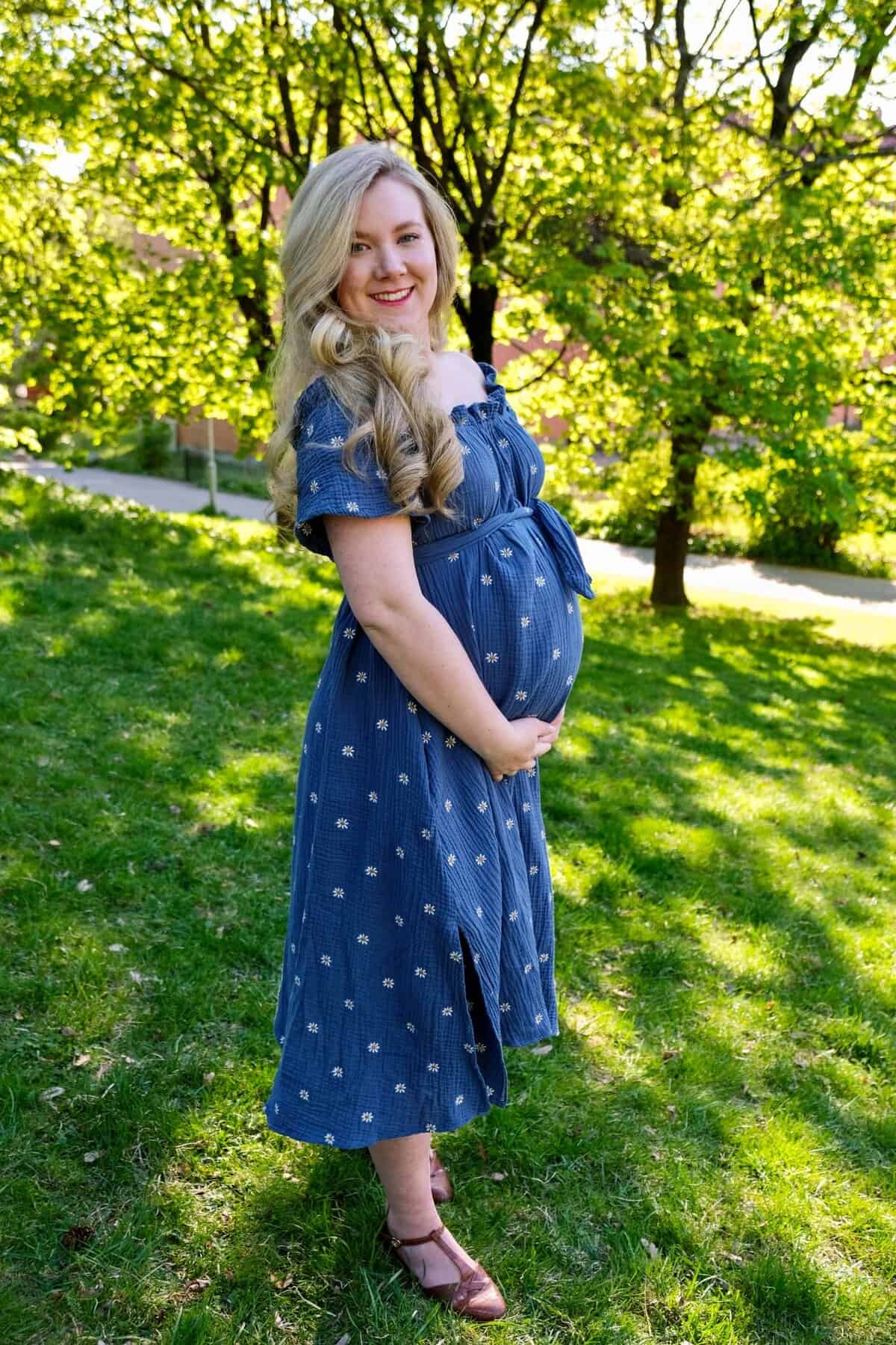 Paired with neutral accessories and sandals, this dress creates a polished yet comfortable look that will have you radiating confidence throughout your pregnancy.