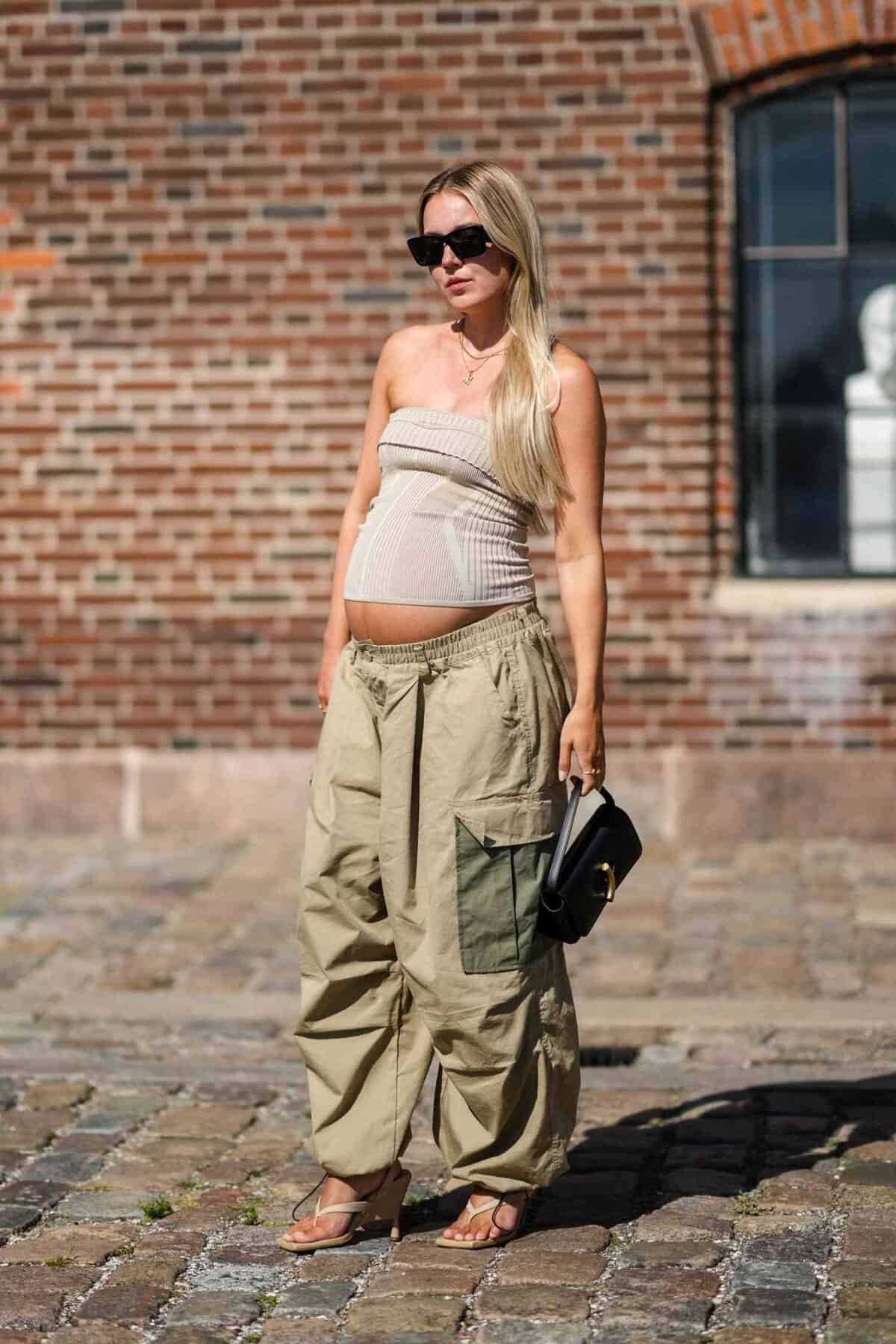 This maternity outfit seamlessly blends comfort with style, perfect for the fashion-forward mom-to-be. The ribbed, strapless crop top in a neutral tone beautifully accentuates the baby bump while keeping you cool and comfortable.