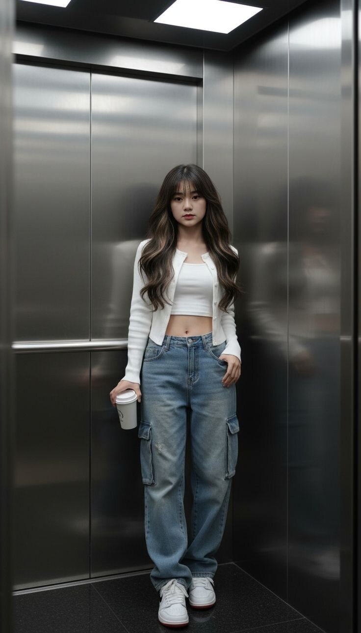Paired with relaxed cargo jeans, this ensemble offers the practicality students need while maintaining an undeniably trendy aesthetic. The white sneakers ground the outfit in casual sophistication, making it easy to transition from class to class.