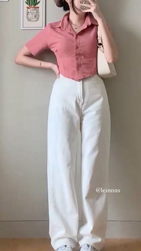 This fresh and timeless combination proves that simple can be incredibly stylish. The soft pink button-up shirt paired with crisp white wide-leg jeans creates a polished, put-together look that”s both comfortable and on-trend.