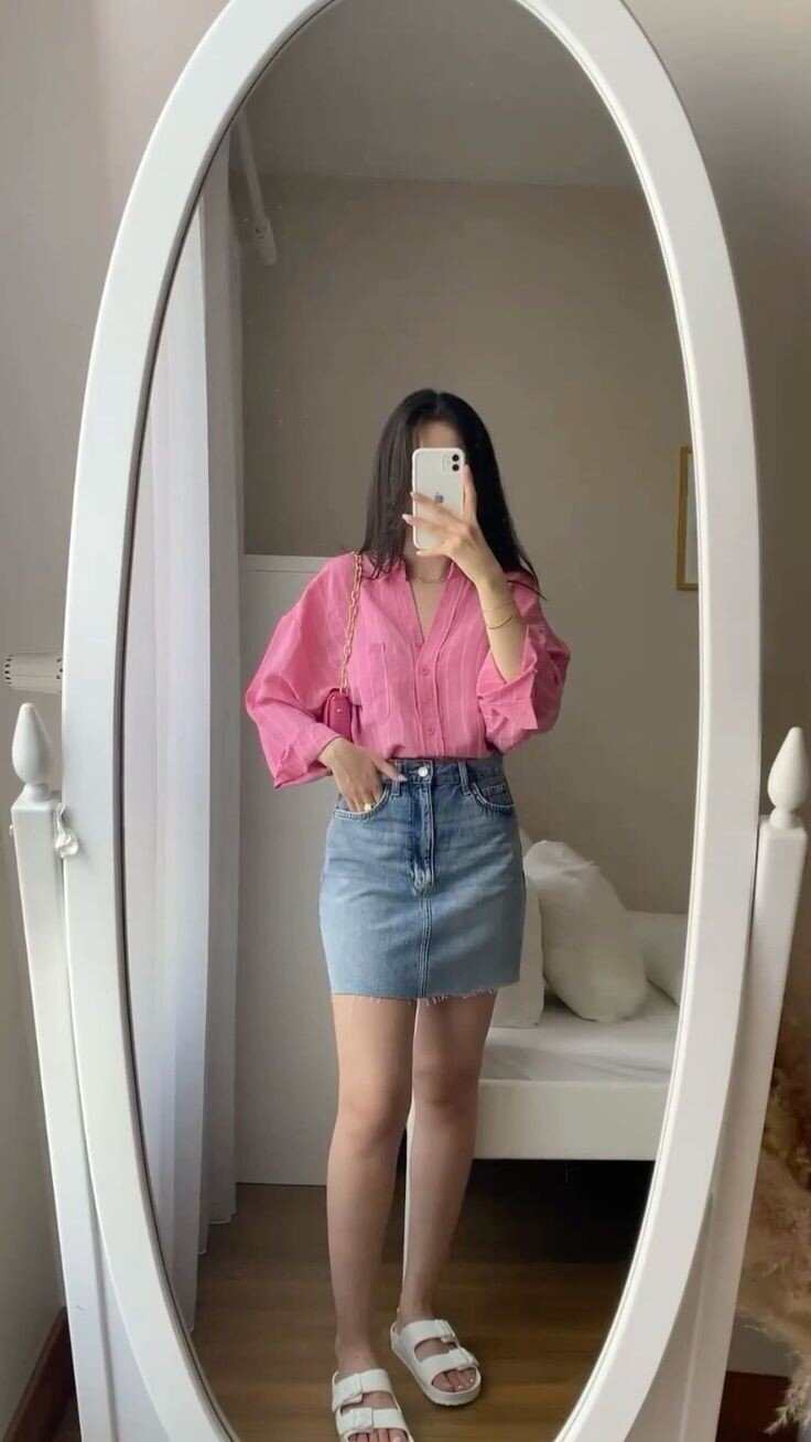 This effortlessly chic ensemble combines a vibrant pink button-up blouse with a classic denim mini skirt, creating the perfect balance between playful and put-together. The soft pink hue adds a cheerful pop of color that instantly lifts your mood, while the crisp denim provides timeless versatility.