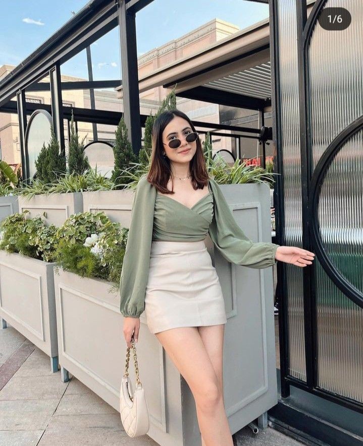 This effortlessly chic combination proves that neutral tones never go out of style, making it the perfect go-to outfit for school days when you want to look polished without trying too hard. The sage green cardigan layered over a cropped top adds a sophisticated pop of color while the cream mini skirt keeps the look fresh and versatile.