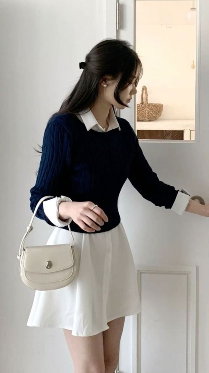 This timeless preppy look combines a navy sweater with a crisp white collared shirt for an effortlessly polished appearance that”s perfect for school. The contrasting colors create visual interest while maintaining a clean, put-together aesthetic that works for any season.