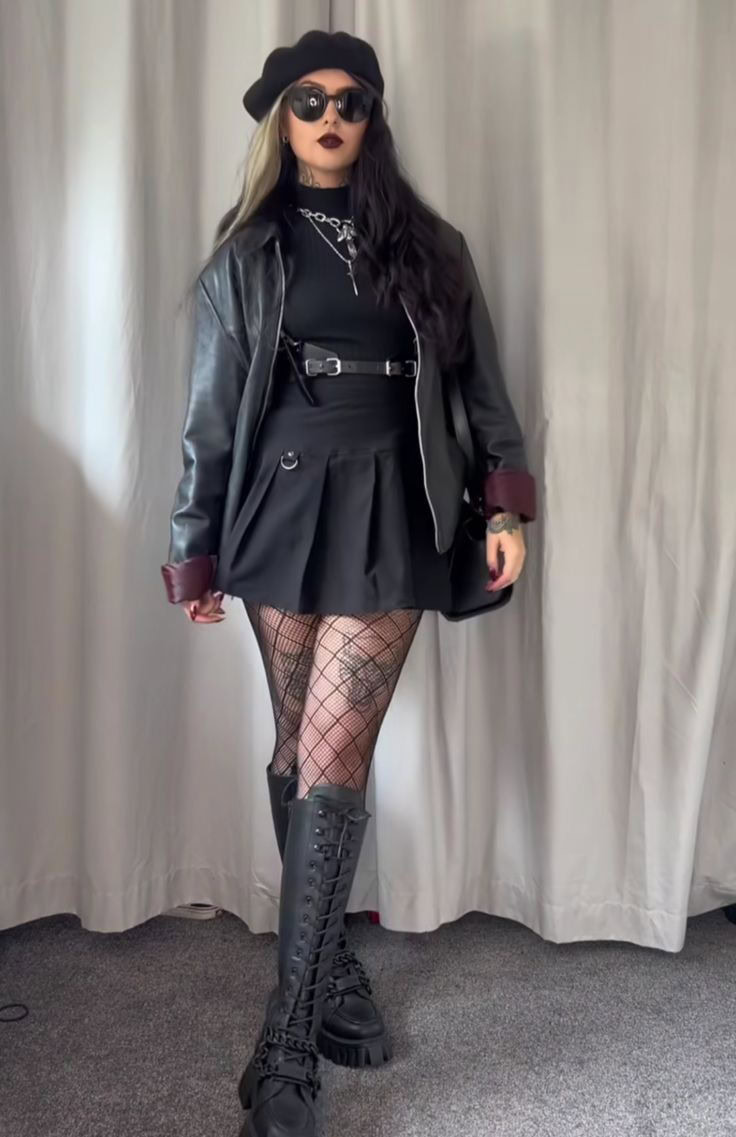 This bold alt winter look combines a sleek black leather jacket with a pleated mini skirt and statement fishnet tights-a timeless goth-inspired ensemble that”s perfect for cold weather while maintaining an edgy aesthetic. The oversized dark sunglasses, beret, and chunky lace-up boots complete the moody vibe, while layering a chain necklace adds extra edge.