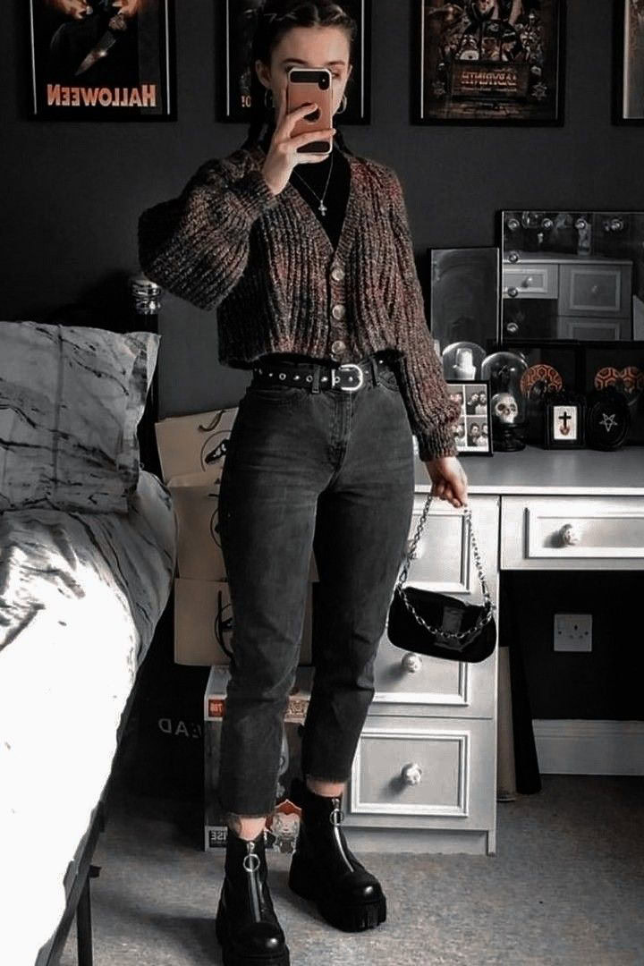 This effortlessly cool combination proves that staying warm doesn”t mean sacrificing style. The oversized rust-colored cropped sweater paired with high-waisted, cuffed vintage jeans creates the perfect balance of cozy and chic-ideal for the alt aesthetic.