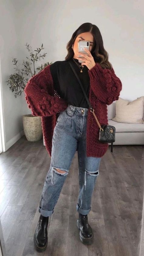 This outfit perfectly captures the essence of alt winter style by mixing cozy textures with edgy details. The oversized burgundy knit cardigan provides warmth and visual interest, while the distressed blue jeans add that rebellious edge that defines alternative fashion.