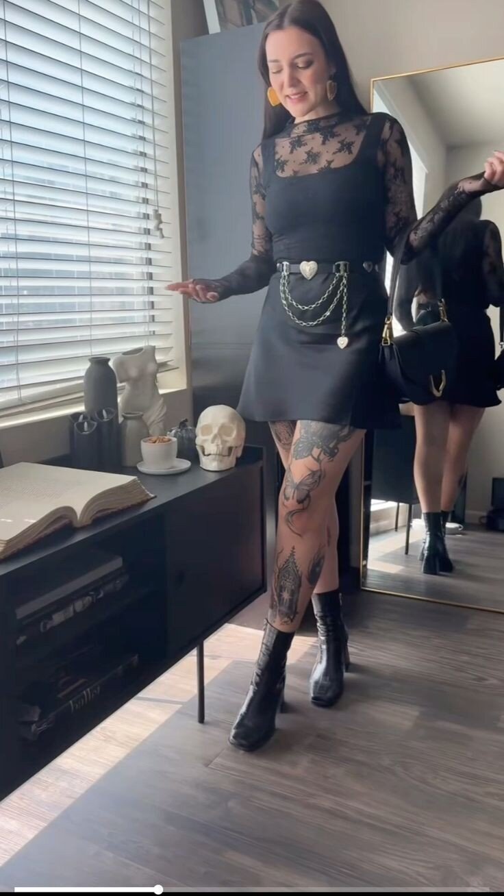 Fishnet stockings peek through, adding another layer of texture and visual interest. This is the kind of outfit that makes cold weather feel like the perfect excuse to lean into your darker, more daring aesthetic while maintaining an air of effortless sophistication that”ll have everyone wondering where you got your style sense.
