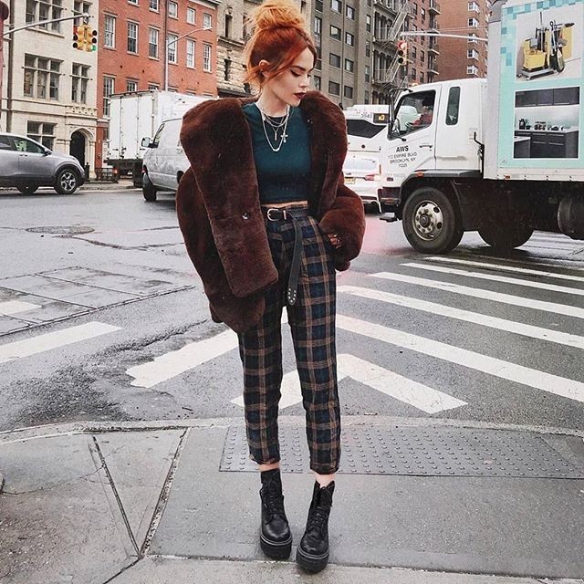 The cropped plaid pants paired with chunky black platform boots ground the look with an edgy sensibility, while the teal knit underneath adds an unexpected color contrast. This is an ideal inspo piece for anyone wanting to elevate their winter wardrobe beyond basic neutrals-the combination of retro glamour and contemporary edge proves that staying warm doesn”t mean sacrificing style.