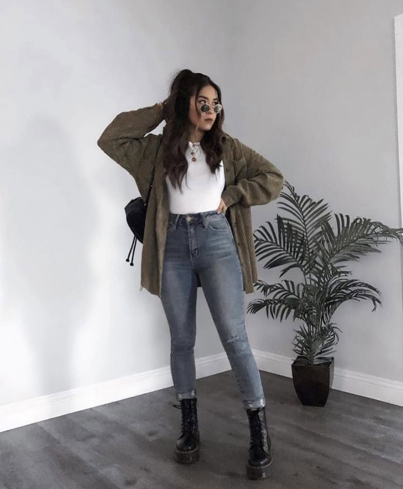 This effortlessly cool look combines a relaxed olive cardigan with cropped blue jeans and combat boots-the ultimate alt winter uniform. The oversized silhouette provides cozy warmth without sacrificing style, while the cropped length prevents bulk and balances proportions perfectly.