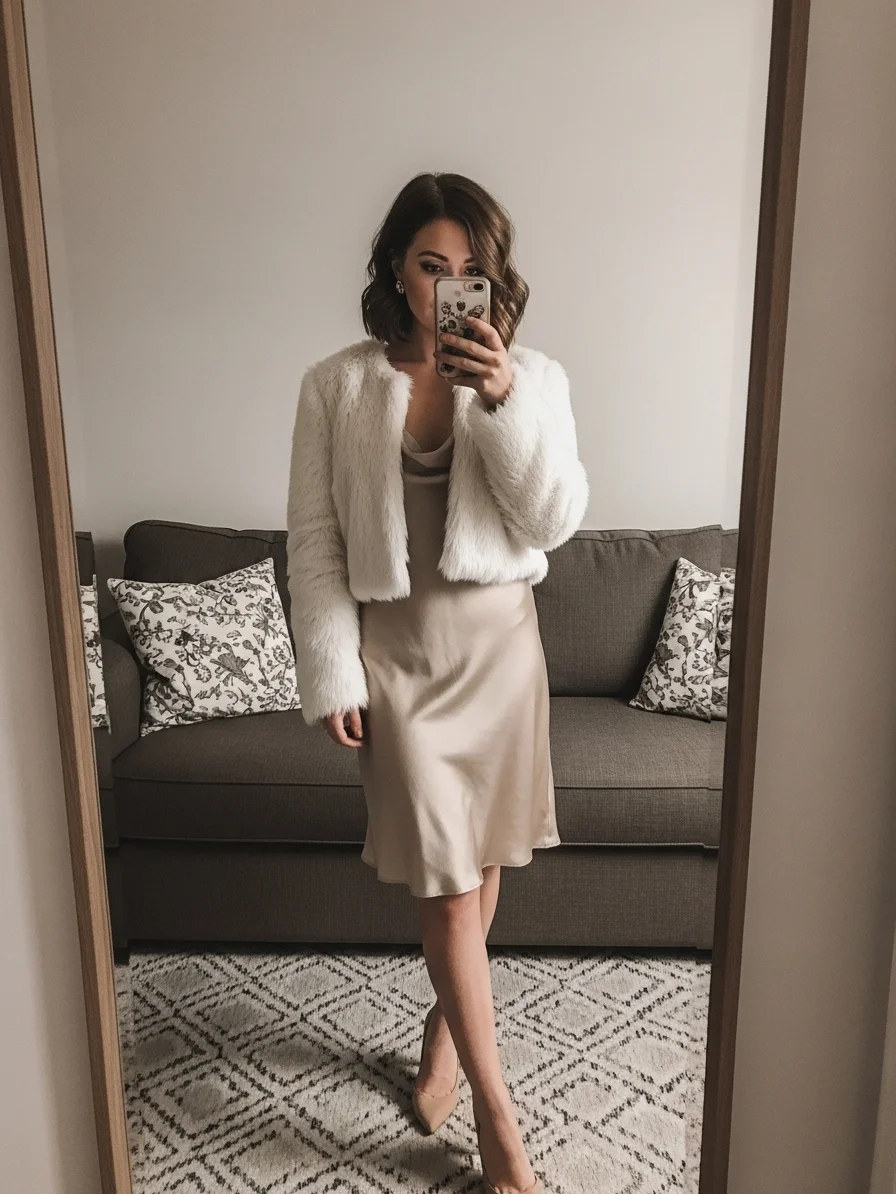 Satin Slip Dress Paired with a Faux Fur Jacket