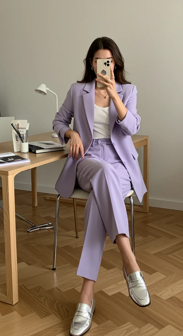A light lavender suit set brings a fresh, feminine touch to office wear.
