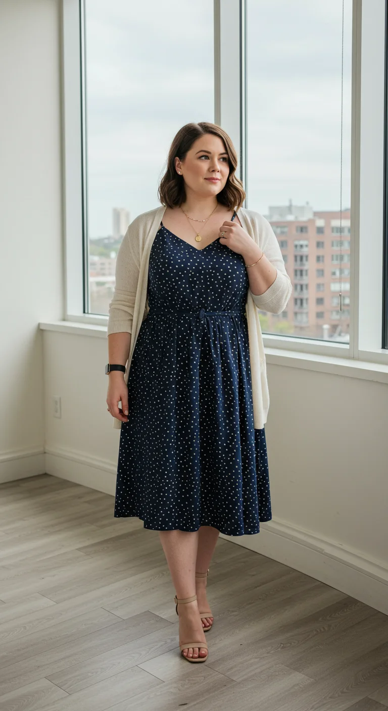 A navy blue sleeveless midi dress with a subtle polka dot print is both fun and professional.