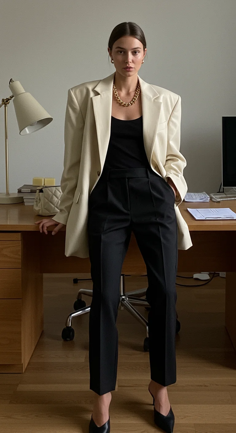An oversized cream blazer adds a contemporary edge to your work wardrobe.