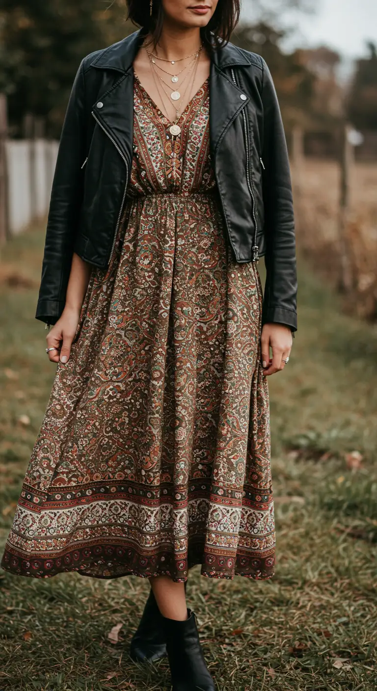 The flowy maxi dress offers a free-spirited base, while the fitted leather jacket adds structure and edge.