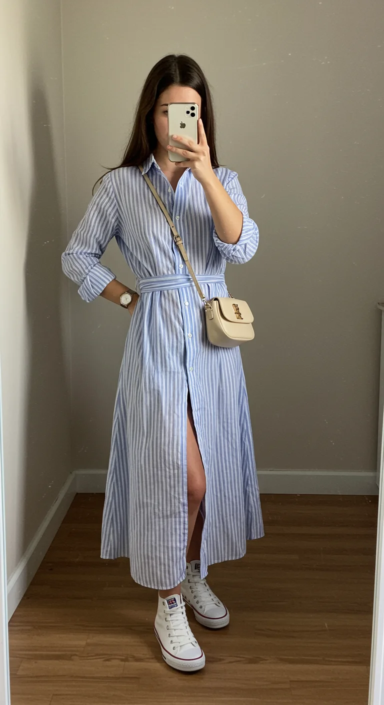 The striped maxi shirt dress offers a polished base, while the sneakers keep it casual.