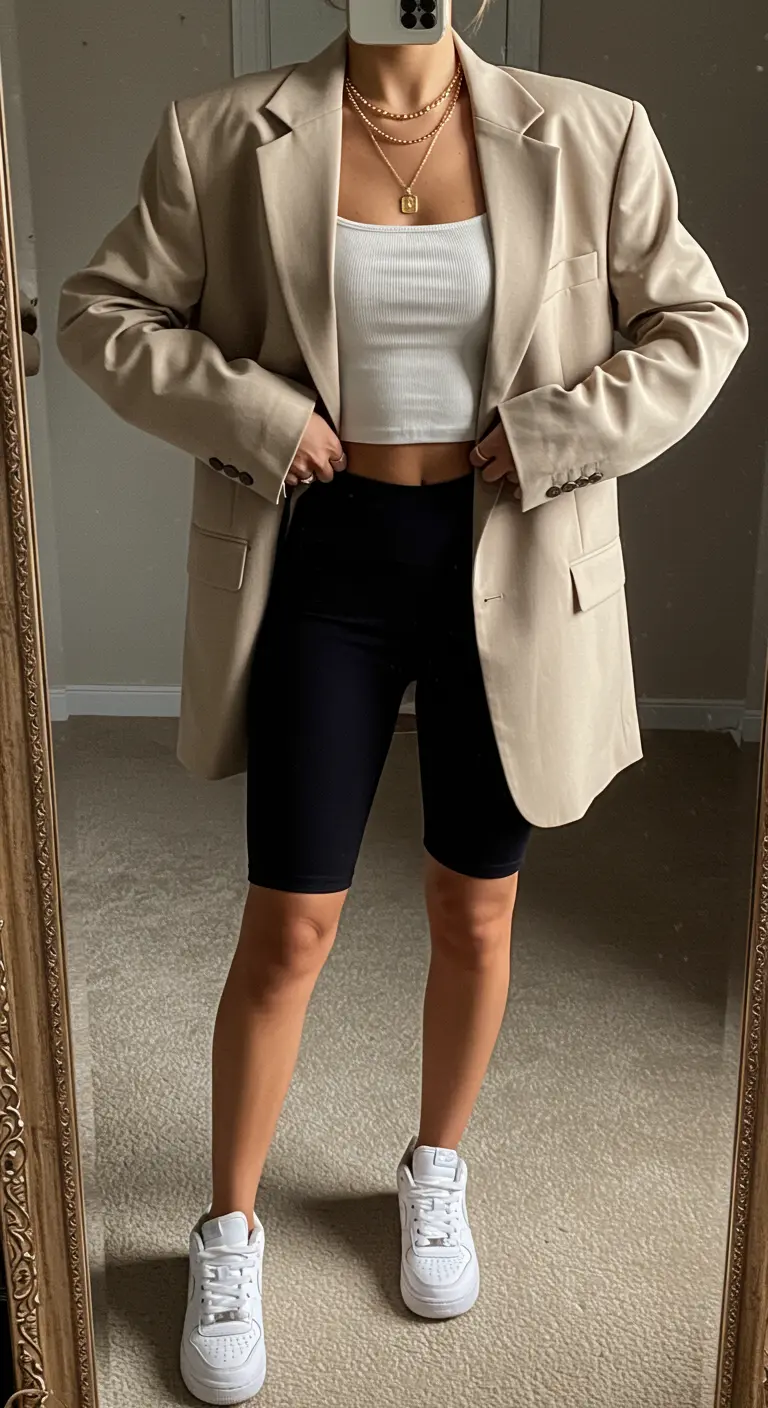 The oversized blazer adds a touch of polish, while the bike shorts keep it casual and comfortable.