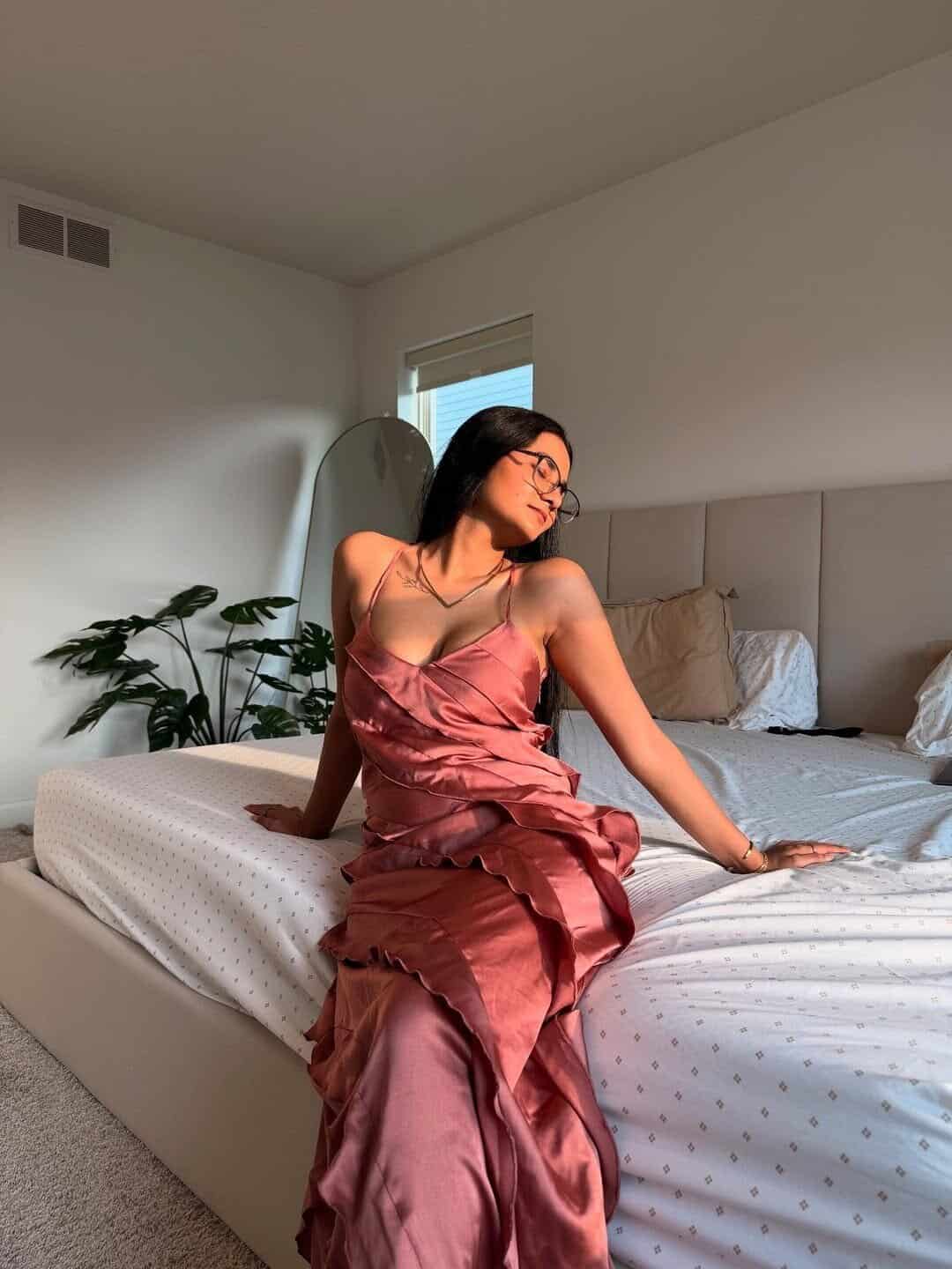 Make a statement at your birthday bash with this stunning satin ruffled maxi slip dress in a luxurious rose gold hue. The flowing silhouette and delicate spaghetti straps exude elegance, while the cascading ruffles add a touch of drama and movement.