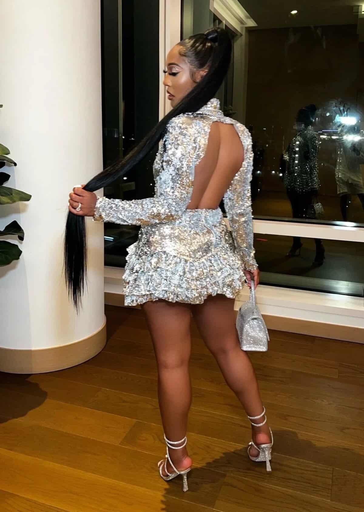 The short hemline and ruffle detail add a playful touch, while the sleek ponytail hairstyle keeps the focus on the dress. This glamorous ensemble is ideal for dancing the night away and making unforgettable birthday memories.