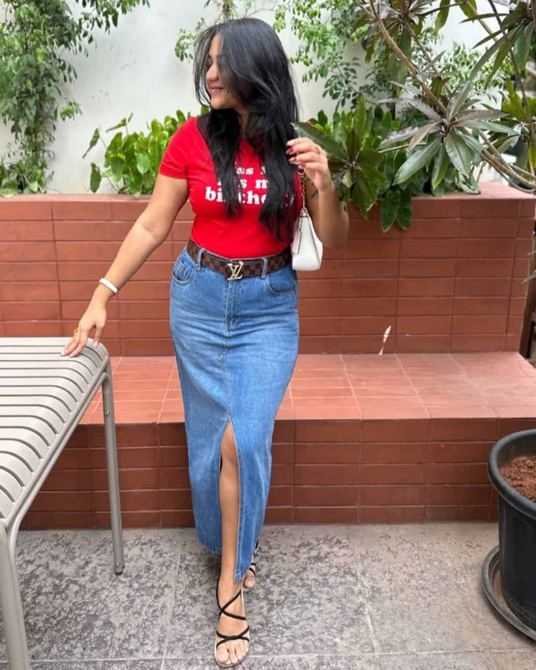 Turn heads at your birthday bash with this effortlessly stylish ensemble. The vibrant red crop top adds a bold pop of color, perfectly balanced by the sleek denim maxi skirt with a daring side slit.