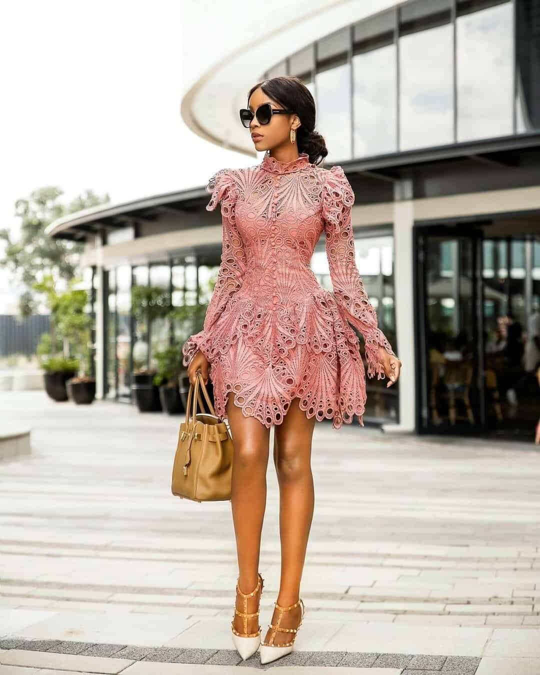 Make a stunning entrance at your birthday bash with this exquisite pink lace dress. The intricate eyelet detailing and scalloped hem create a romantic, feminine silhouette thats perfect for the ultimate party queen.
