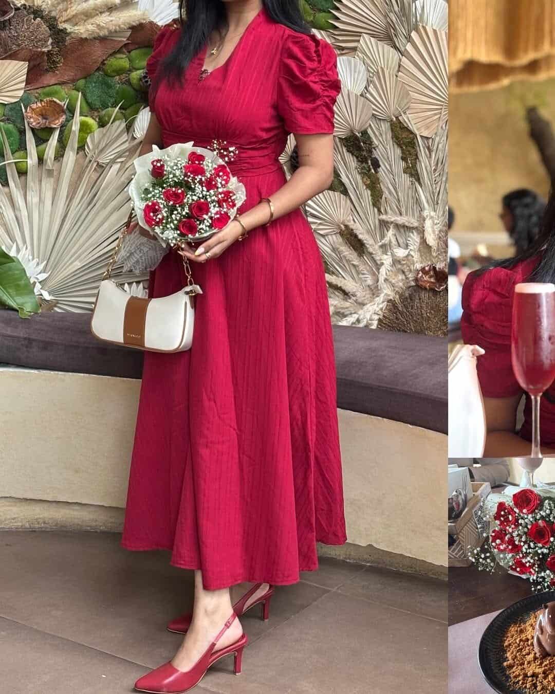 Make a bold statement at your birthday bash with this stunning red maxi dress. The vibrant hue demands attention, while the elegant silhouette with puff sleeves and a cinched waist flatters any figure.