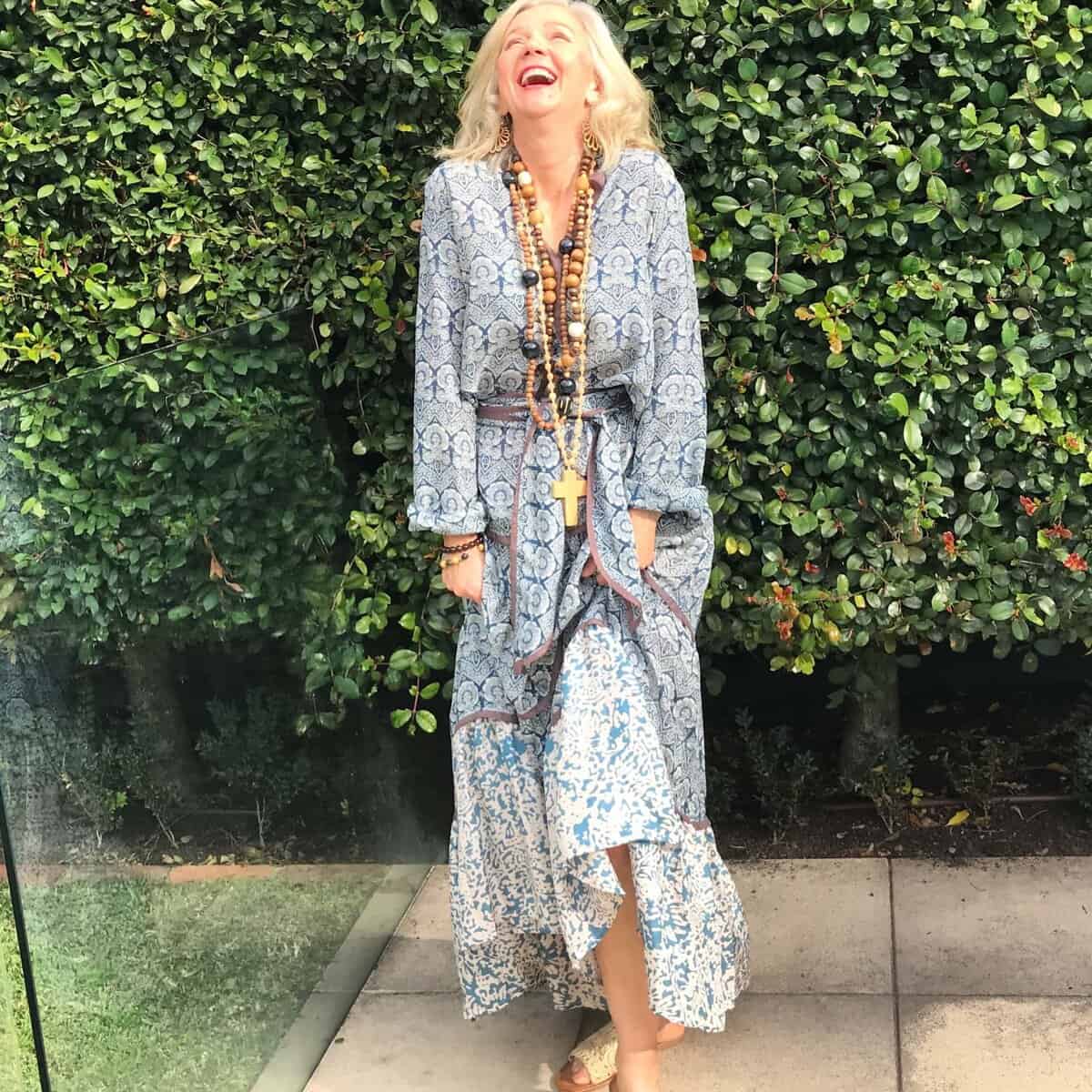 Embrace the spirit of fall with this effortlessly chic boho-inspired outfit. The flowing maxi dress in a blue and white pattern exudes confidence and grace, perfect for women over 40 who want to make a statement. Layered with a complementary patterned kimono-style jacket, this ensemble offers versatility and comfort. The look is elevated with eye-catching accessories – a long wooden bead necklace and a statement cross pendant add a touch of artisanal flair. Completed with simple, neutral-toned sandals, this outfit strikes the ideal balance between casual and sophisticated, making it suitable for various autumn occasions from brunch with friends to art gallery openings.