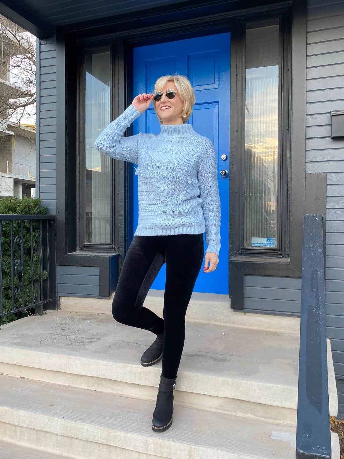 This effortlessly stylish ensemble proves that comfort and elegance can coexist beautifully for women over 40. The powder blue sweater with its subtle fringe detail adds a touch of whimsy to a classic silhouette, while the black leggings provide a sleek foundation. Paired with ankle boots and aviator sunglasses, this outfit strikes the perfect balance between casual and put-together. It’s an ideal choice for running errands or meeting friends for coffee on a crisp autumn day. The look demonstrates how a few well-chosen pieces can create a chic, age-appropriate outfit that’s both trendy and timeless.