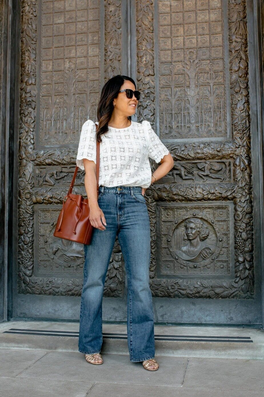 This effortlessly chic ensemble proves that style knows no age. The delicate white lace top with its romantic puff sleeves adds a touch of femininity and sophistication, perfect for women over 40 who want to embrace their feminine side while maintaining a mature elegance. Paired with classic blue jeans, the outfit strikes the ideal balance between casual and refined. The addition of tan leather sandals and a woven tote bag completes the look with a nod to fall’s earthy tones. This versatile combination works wonderfully for a variety of autumn occasions, from casual brunches to afternoon outings, showcasing how women can effortlessly blend timeless pieces with seasonal trends for a polished yet relaxed fall look.