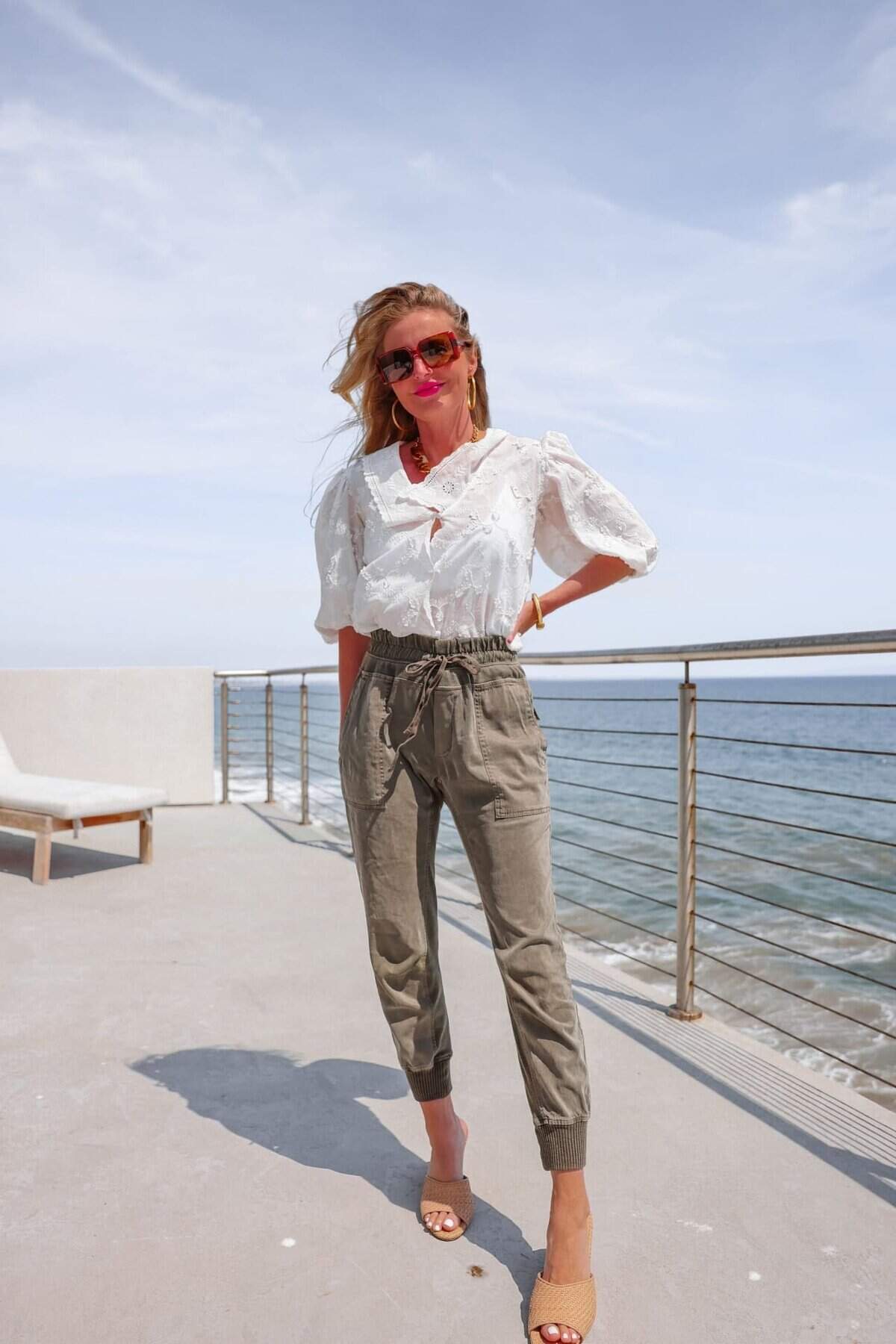 This ensemble perfectly captures the essence of effortless fall style for women over 40. The crisp white eyelet blouse with puff sleeves adds a touch of romance and sophistication, while the olive green jogger pants offer comfort without sacrificing style. The contrast between the feminine top and casual bottoms creates a balanced look that’s both elegant and relaxed. Accessorized with statement sunglasses, gold jewelry, and woven slide sandals, this outfit transitions seamlessly from a casual daytime look to an evening by the sea. It’s a versatile choice that demonstrates how women can embrace current trends while maintaining a timeless and age-appropriate aesthetic.