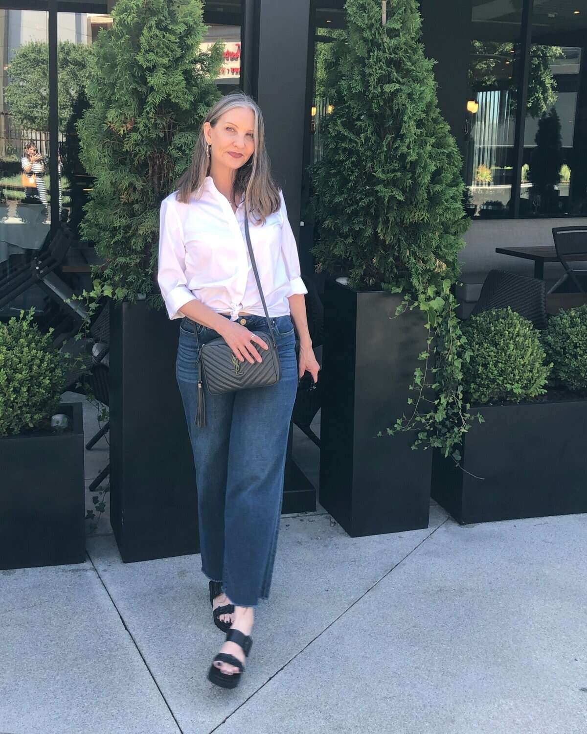 This timeless ensemble proves that simplicity is the ultimate sophistication for women over 40. The crisp white button-down shirt, knotted at the waist, exudes effortless elegance while flattering the figure. Paired with on-trend wide-leg jeans, the outfit strikes a perfect balance between comfort and style. The addition of a chic crossbody bag and understated black sandals completes this versatile look, suitable for various fall occasions. This outfit demonstrates how women can embrace current fashion trends while maintaining a refined and age-appropriate aesthetic, making it an essential addition to any fall wardrobe for the fashion-forward woman over 40.