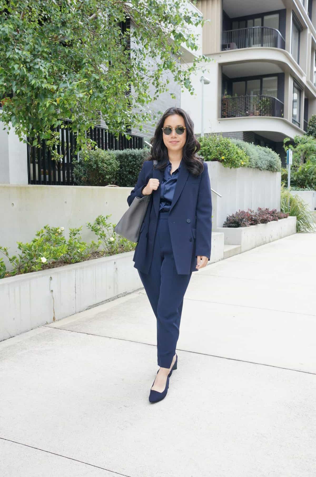 Elevate your casual office style this fall with a sophisticated monochromatic navy ensemble. This chic outfit features a well-tailored navy blazer paired with matching trousers, creating a sleek and professional silhouette. The look is complemented by a coordinating navy blouse, adding depth and texture to the monochrome palette. Accessorized with round sunglasses and a structured grey tote, this outfit strikes the perfect balance between polished and approachable. The navy pumps complete the look, ensuring a cohesive and elongating effect. This versatile suit is an excellent investment piece for your fall work wardrobe, easily transitioning from client meetings to after-work events with effortless grace.
