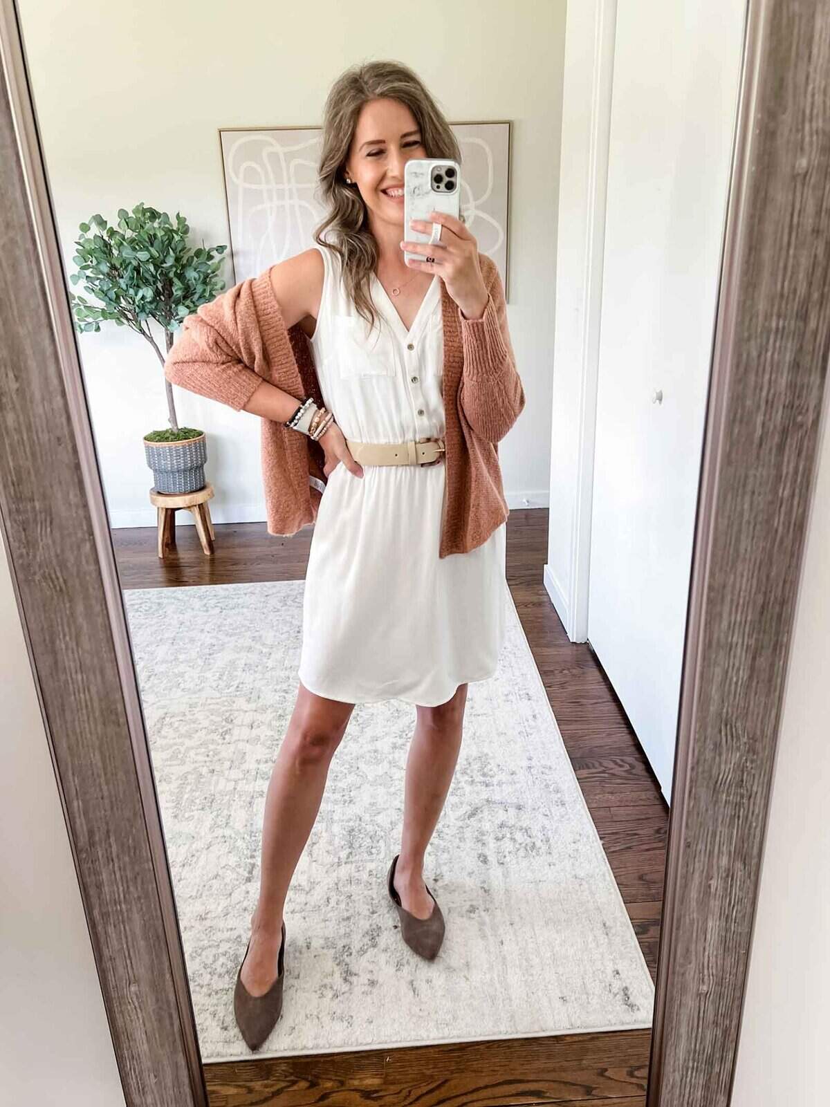 Elevate your casual office style this fall with a versatile white button-up dress paired with a cozy peach cardigan. This ensemble strikes the perfect balance between professional and comfortable, making it ideal for the transitional autumn weather. The lightweight dress serves as a blank canvas, while the soft, knit cardigan adds warmth and a pop of seasonal color. Cinch the waist with a neutral belt to create a flattering silhouette, and complete the look with earth-toned flats for all-day comfort. This outfit effortlessly combines summer’s airiness with fall’s coziness, allowing you to navigate the changing seasons with style and grace in any casual office setting.