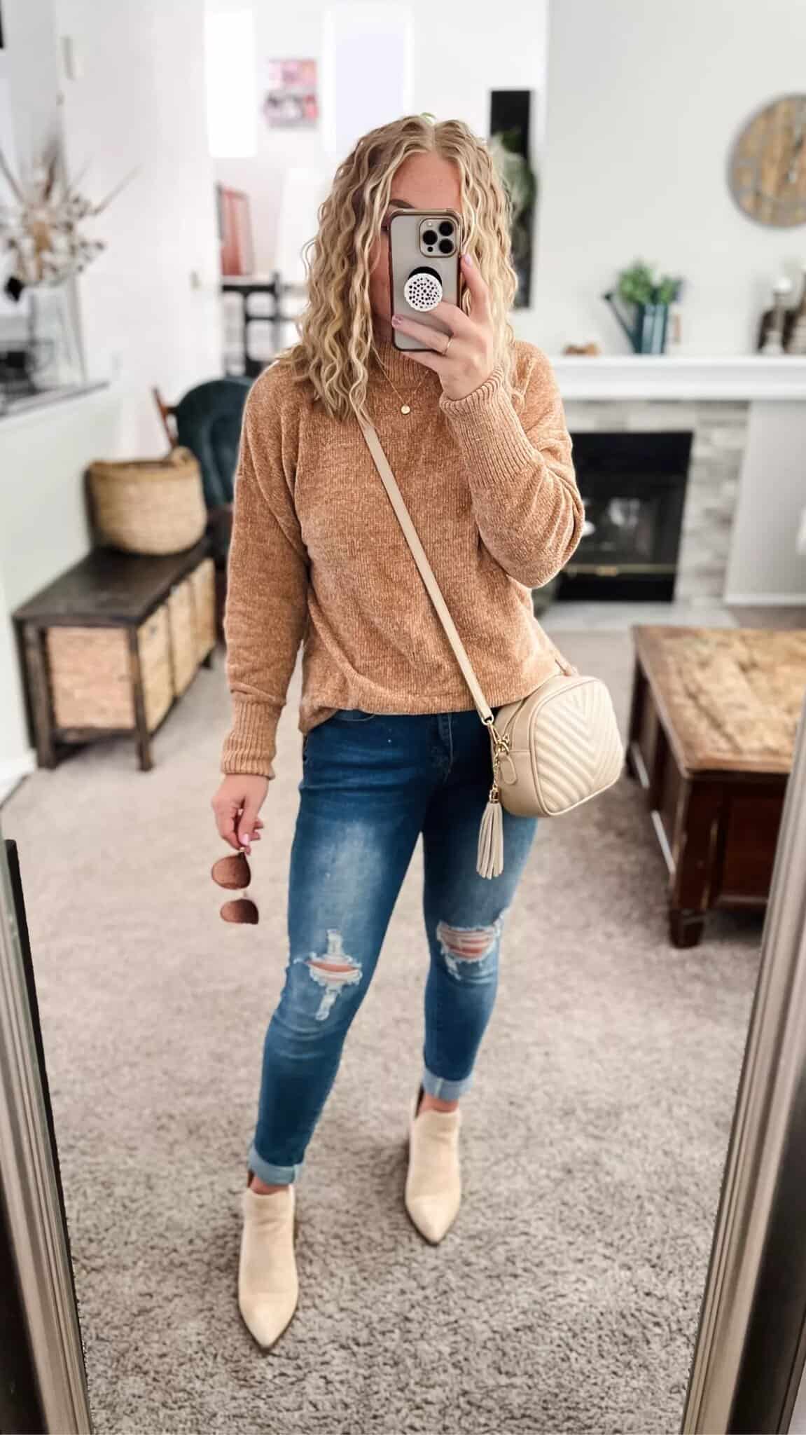 Embrace the perfect balance of comfort and style with this chic fall ensemble. The camel-colored chunky knit sweater exudes warmth and sophistication, ideal for those crisp autumn days at the office. Paired with distressed skinny jeans, it strikes the right note between casual and polished. The outfit is cleverly accessorized with a neutral crossbody bag and matching ankle boots, creating a cohesive look that’s both trendy and office-appropriate. This combination showcases how to incorporate relaxed elements into your work wardrobe without sacrificing professionalism. It’s a versatile outfit that can easily transition from a day at the desk to after-work gatherings, embodying the essence of casual office style for the fall season.