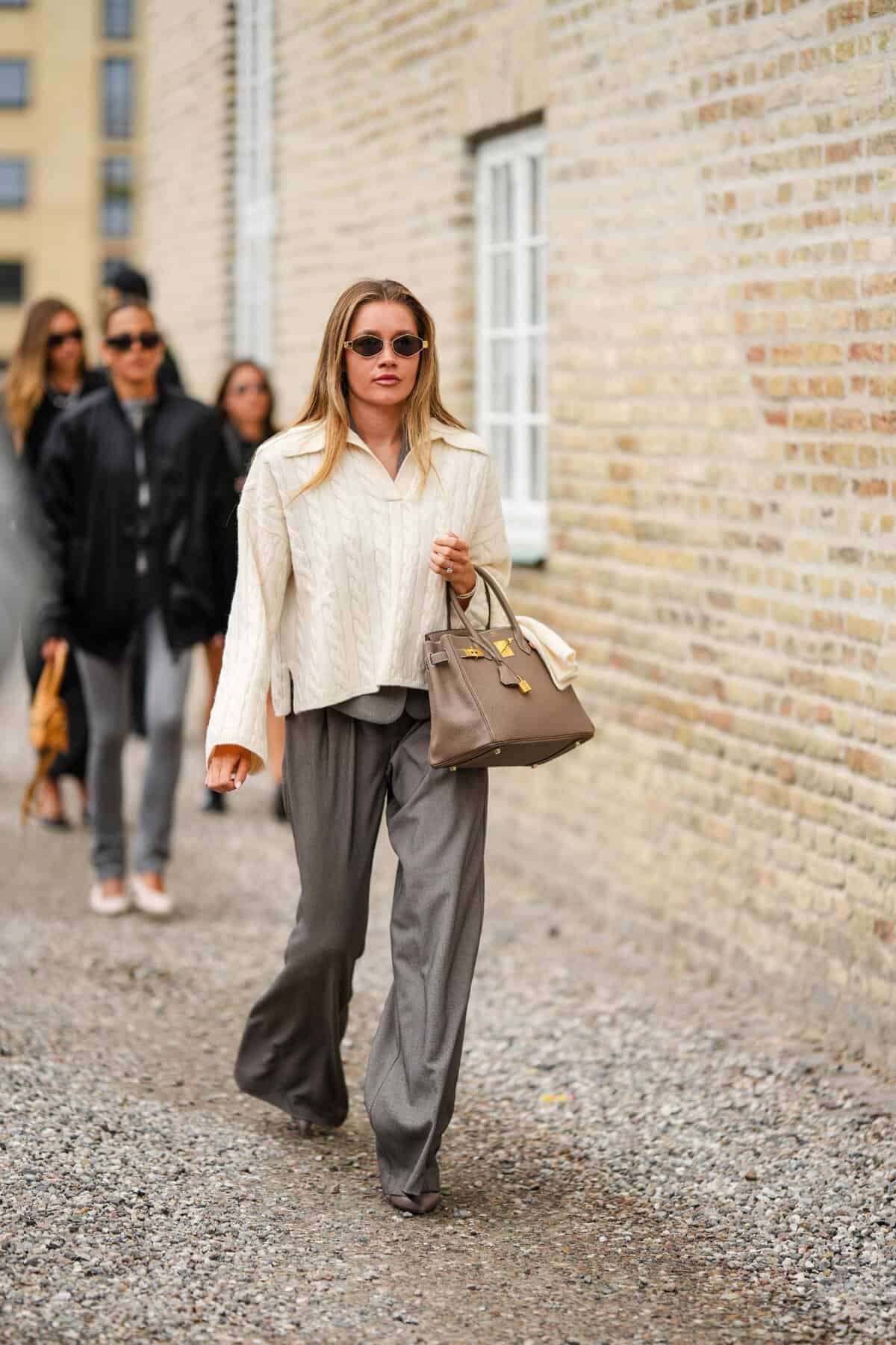 Elevate your casual office style this fall with a sophisticated combination of textures and neutral tones. This ensemble features a cream cable-knit sweater with a relaxed fit and wide collar, paired perfectly with flowing gray trousers. The cropped length of the sweater adds a modern touch, while the wide-leg pants create a sleek, elongated silhouette. Accessorize with retro-inspired sunglasses and a structured leather handbag in a complementary taupe shade for a polished finish. This outfit strikes the ideal balance between comfort and professionalism, making it an excellent choice for the fashion-forward professional navigating the cooler months with effortless grace.