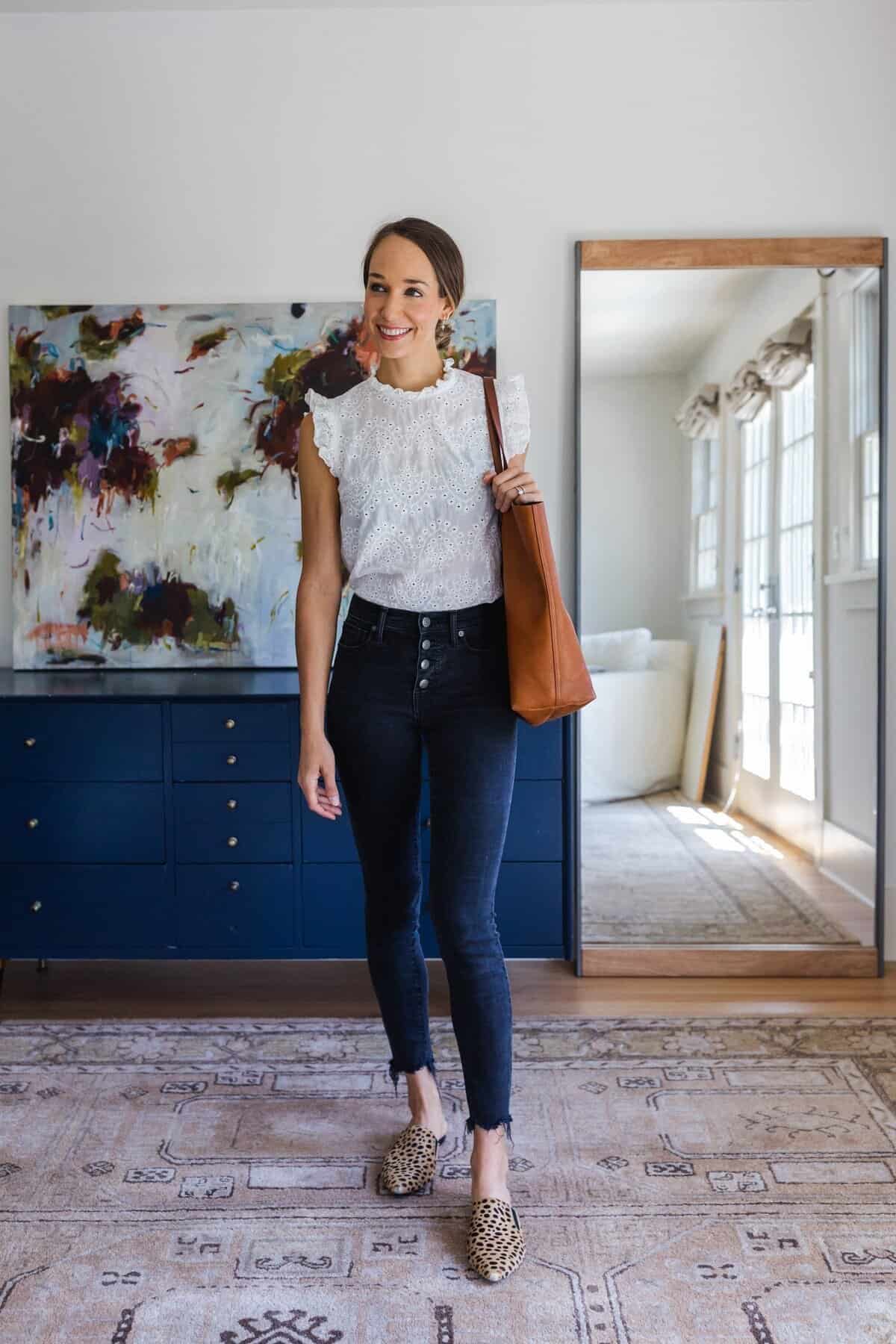 Elevate your casual office style with this effortlessly chic combination of a white eyelet blouse and dark skinny jeans. The delicate eyelet pattern adds a touch of feminine charm to the outfit, while the crisp white color keeps it fresh and professional. The high-waisted, button-fly jeans offer a modern twist on classic denim, creating a sleek silhouette. Leopard print mules introduce a playful element, perfect for transitioning from summer to fall. Accessorized with a cognac leather tote, this ensemble strikes the ideal balance between polished and relaxed, making it a versatile choice for various workplace settings. It’s a perfect example of how to blend comfort with style in your fall work wardrobe.