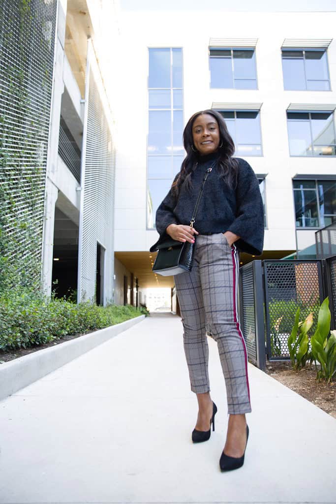 Elevate your casual office style this fall with a sophisticated blend of comfort and professionalism. This ensemble features a plush, dark sweater paired with eye-catching plaid trousers, creating a perfect balance between cozy and chic. The cropped length of the pants adds a modern touch, while the side stripe detail injects a subtle sporty element. Completed with classic black pumps and a sleek crossbody bag, this outfit demonstrates how to seamlessly incorporate trendy elements into a polished work look. It’s an ideal choice for those crisp autumn days when you want to feel both warm and stylish in the office.