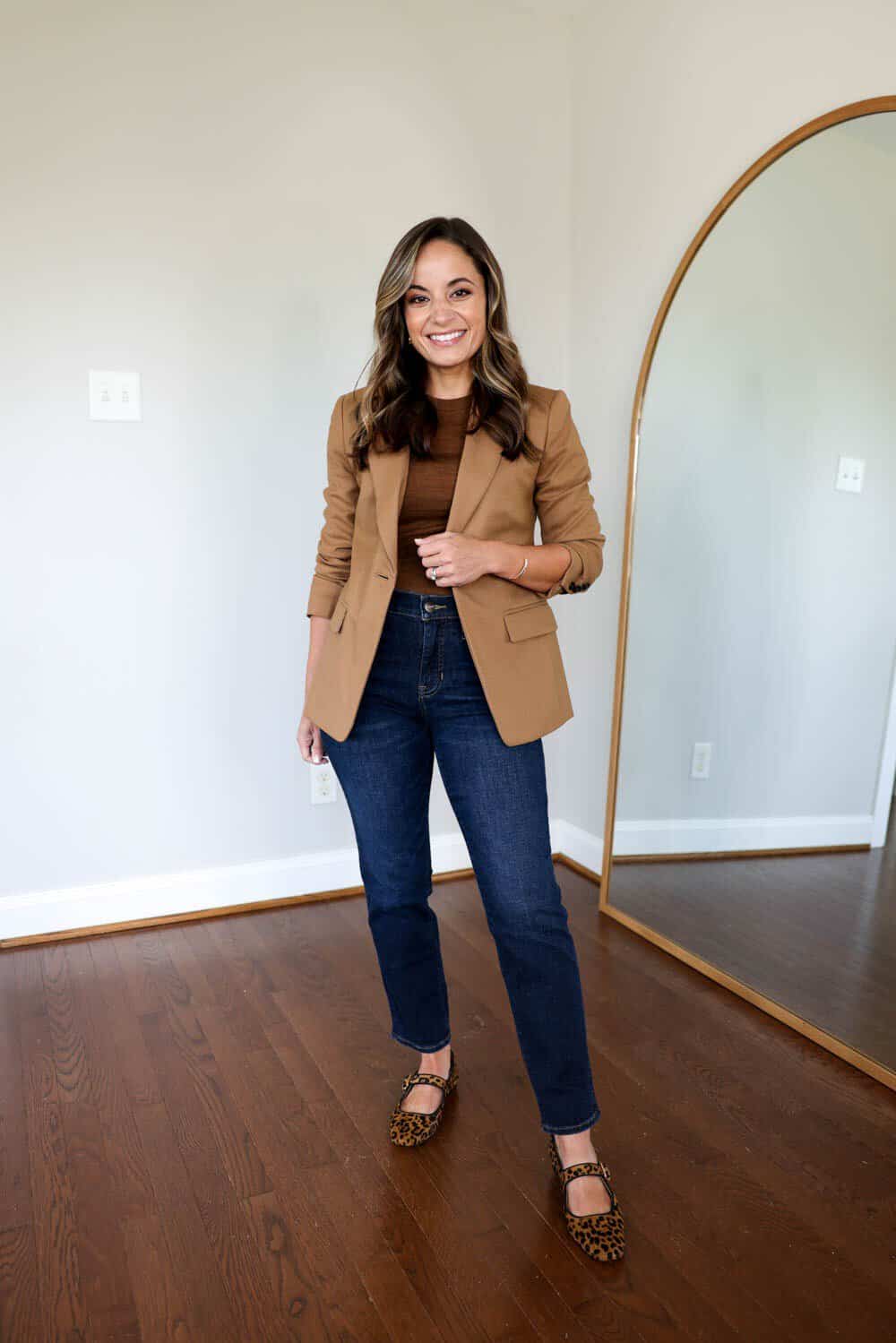 Elevate your casual office style this fall with a classic camel blazer paired with dark wash jeans. This versatile combination strikes the perfect balance between professional and relaxed, making it ideal for a modern workplace. The structured blazer adds a polished touch to the outfit, while the jeans keep it comfortably casual. Accessorize with leopard print flats for a playful pop of pattern that ties the look together. This ensemble demonstrates how to seamlessly blend timeless pieces with contemporary elements, creating a chic and effortless fall work outfit that’s both stylish and appropriate for a range of office environments.