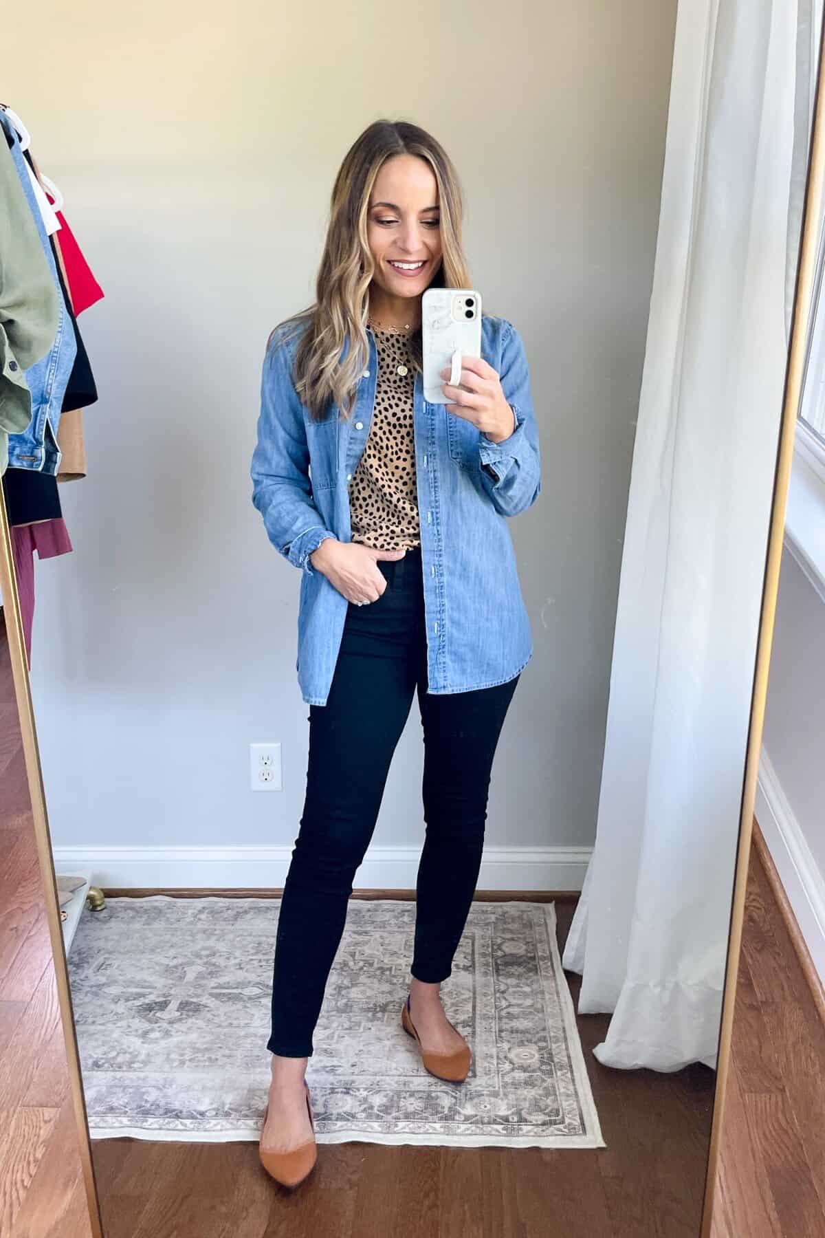 Elevate your casual office style this fall with a chic layering technique. The outfit showcases a light-wash denim shirt worn open over a leopard print top, paired with sleek dark jeans and brown flats. This combination strikes the perfect balance between professional and trendy, ideal for a relaxed workplace environment. The denim shirt adds a cool, casual vibe while the leopard print introduces a touch of sophistication. The dark jeans create a streamlined silhouette, and the neutral flats complete the look with comfort and style. This ensemble demonstrates how mixing textures and patterns can create a fashionable yet work-appropriate outfit for the autumn season.