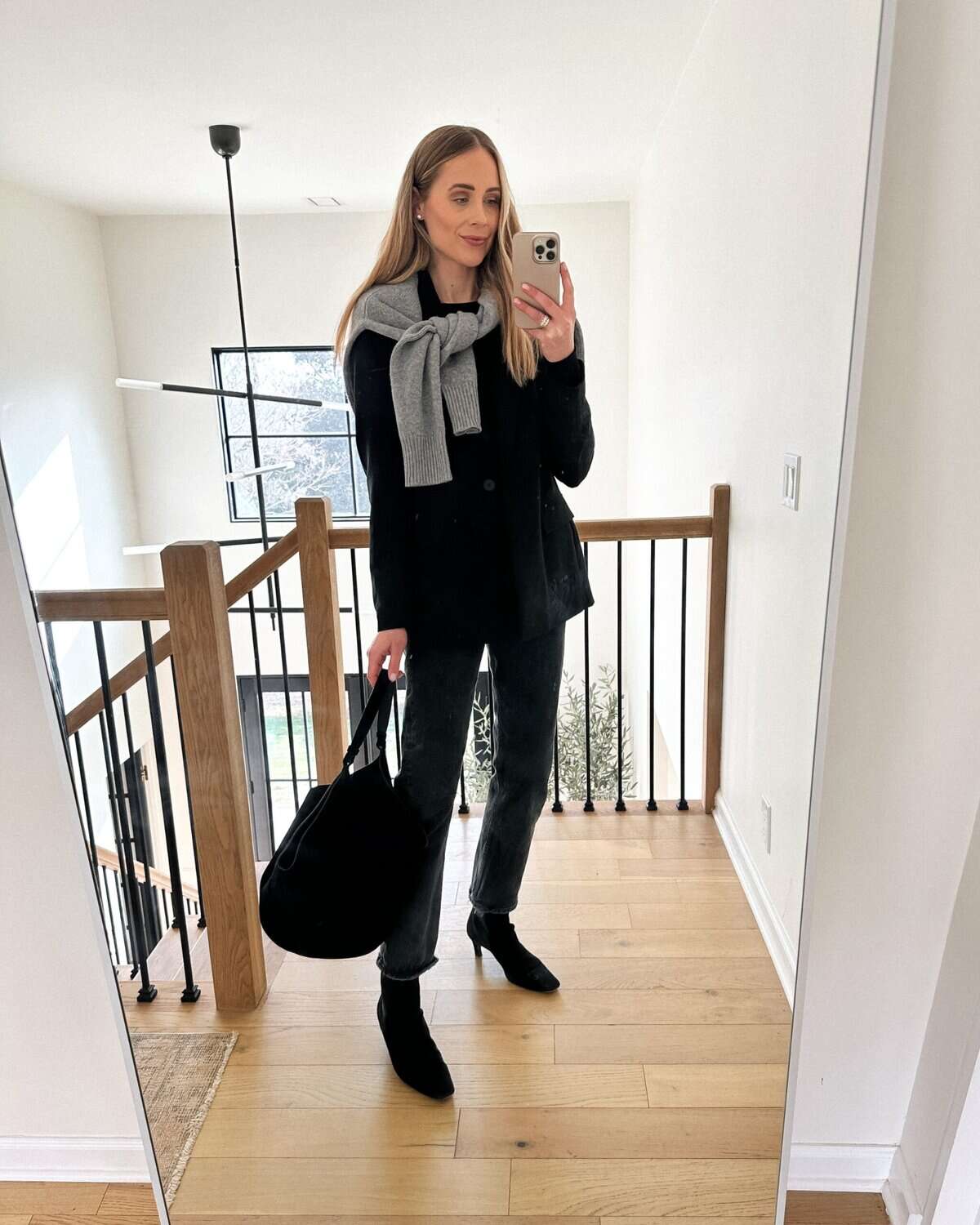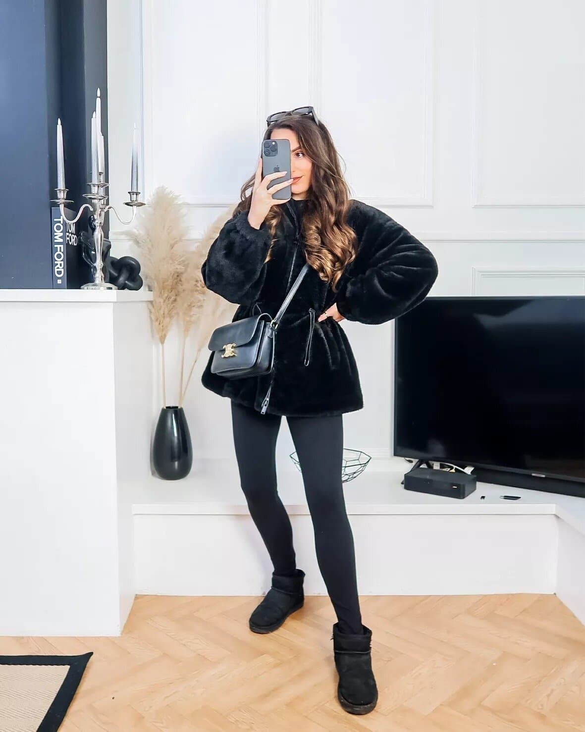 Embrace the cooler weather with this effortlessly chic all-black ensemble that’s perfect for a casual office setting. The plush faux fur jacket adds a touch of luxury while providing warmth, making it an ideal layering piece for fall. Paired with sleek leggings and comfortable ankle boots, this outfit strikes the perfect balance between comfort and style. The structured black handbag adds a professional touch, ensuring you’re ready for any impromptu meetings. This look demonstrates how monochromatic outfits can be both sophisticated and relaxed, ideal for navigating the transition from summer to fall in the workplace.