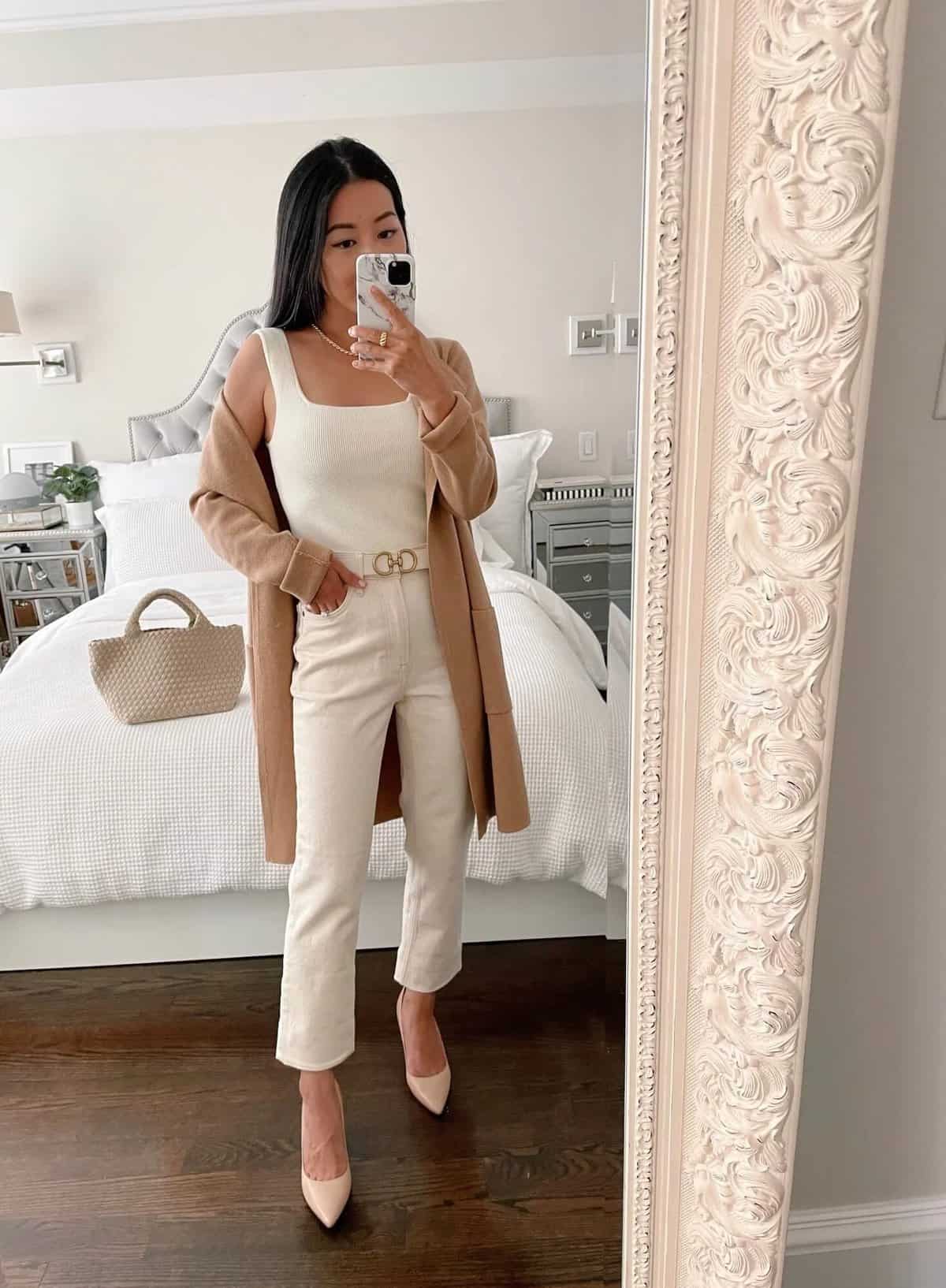 Elevate your casual office style this fall with a sophisticated monochromatic ensemble. This outfit perfectly balances comfort and professionalism, featuring a crisp white tank top paired with high-waisted cream trousers. The ensemble is beautifully tied together with a long, cozy camel cardigan that adds warmth and polish. Nude pumps elongate the silhouette, while a statement belt cinches the waist for a flattering shape. Accessorize with delicate jewelry and a textured handbag to complete this chic, office-ready look. This versatile combination demonstrates how neutral tones can create a powerful, put-together appearance that’s ideal for the autumn season.