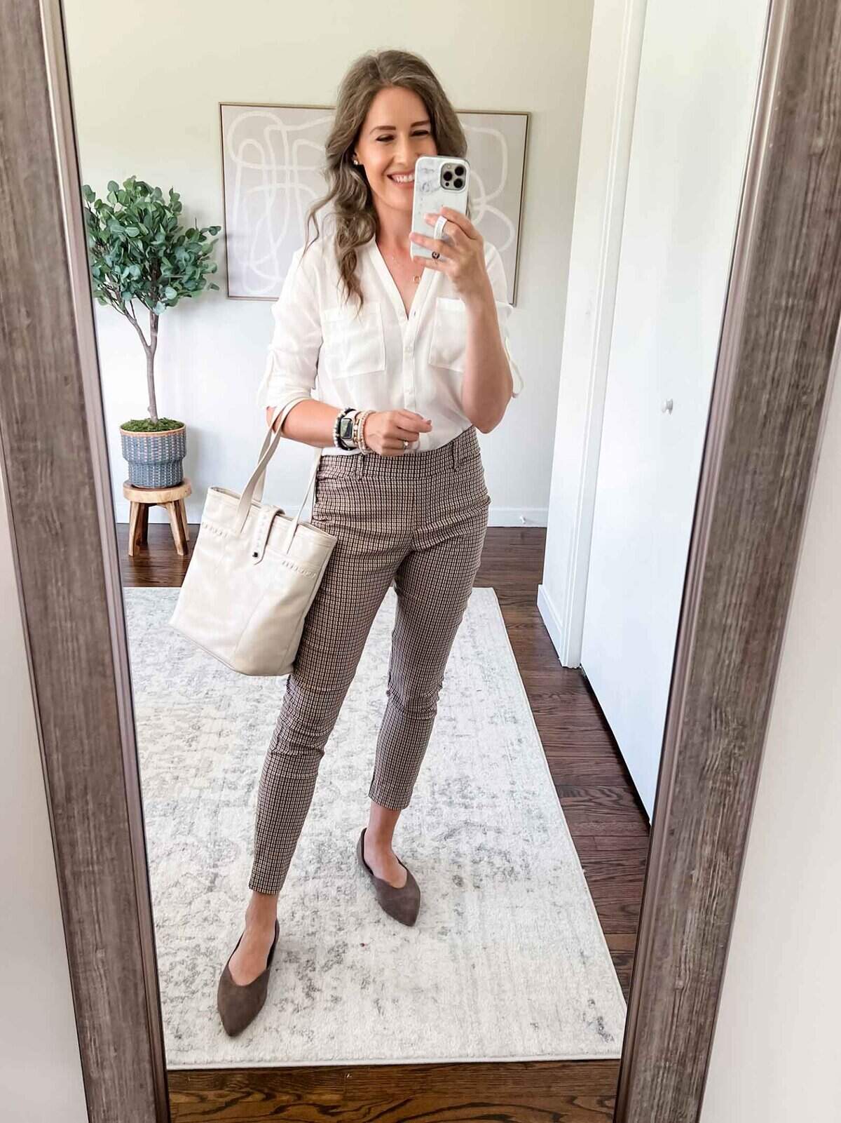 Elevate your casual office style this fall with a timeless combination of a crisp white blouse and tailored checked pants. This ensemble strikes the perfect balance between professional and relaxed, making it ideal for the modern workplace. The loose-fitting white blouse adds a touch of elegance, while the fitted checked pants bring a subtle pattern and warmth to the outfit. Accessorize with a neutral tote bag and comfortable pointed flats in a complementary earthy tone. This versatile look can easily transition from desk to dinner, embodying the essence of chic fall work attire. The neutral color palette allows for easy mixing and matching with other wardrobe staples, ensuring you’ll get plenty of wear throughout the season.