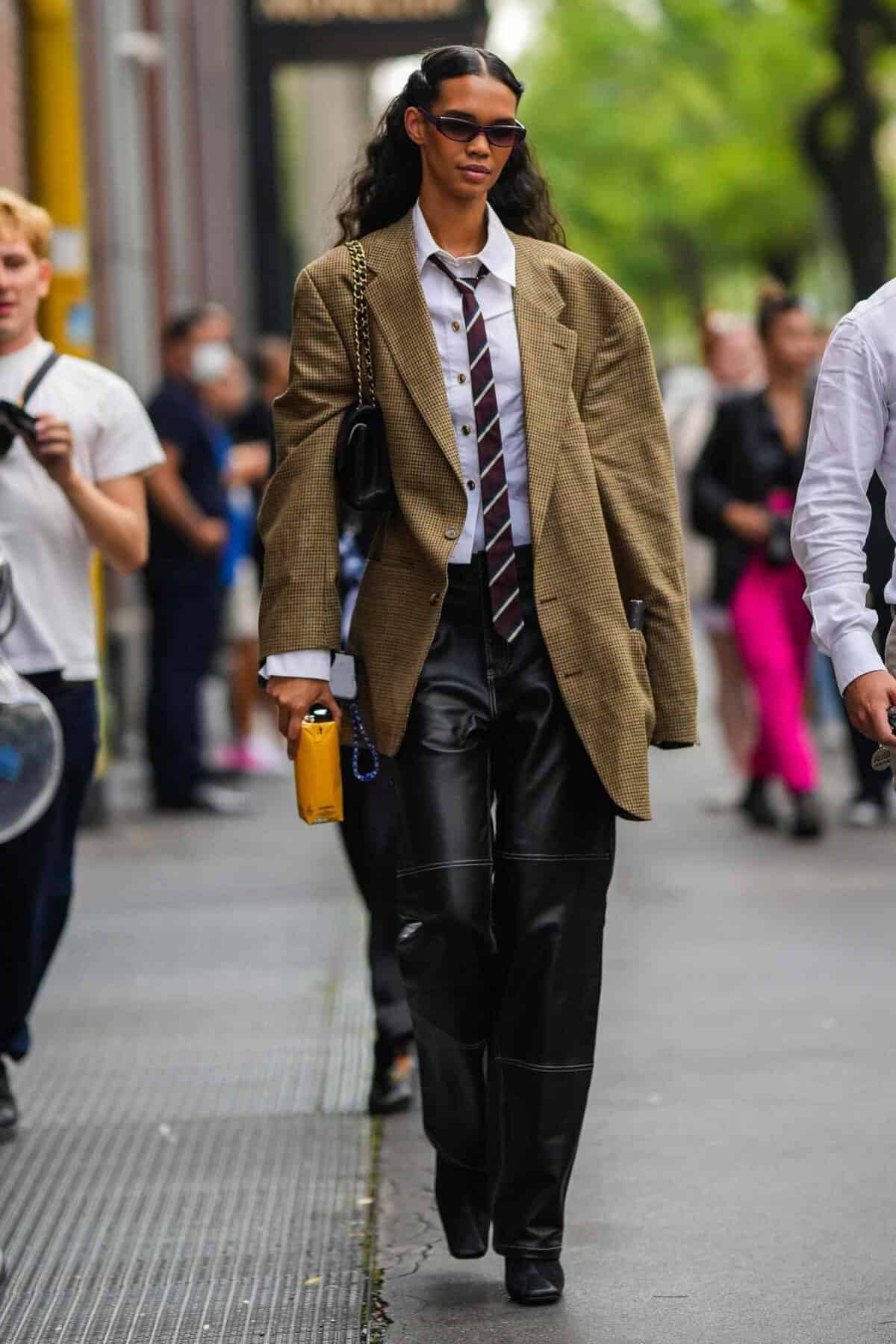 This outfit perfectly embodies the fusion of classic professionalism and contemporary edge, ideal for making a statement in the fall office environment. The oversized tan plaid blazer adds a touch of sophistication while providing warmth for cooler days. Paired with sleek black leather pants, the ensemble strikes a balance between traditional and modern aesthetics. The crisp white shirt and striped tie maintain a professional look, while the chunky black shoes and trendy sunglasses infuse a dash of urban chic. Accessorized with a chain-strap bag and a pop of color from the yellow clutch, this outfit demonstrates how to turn heads while staying work-appropriate in the autumn season.