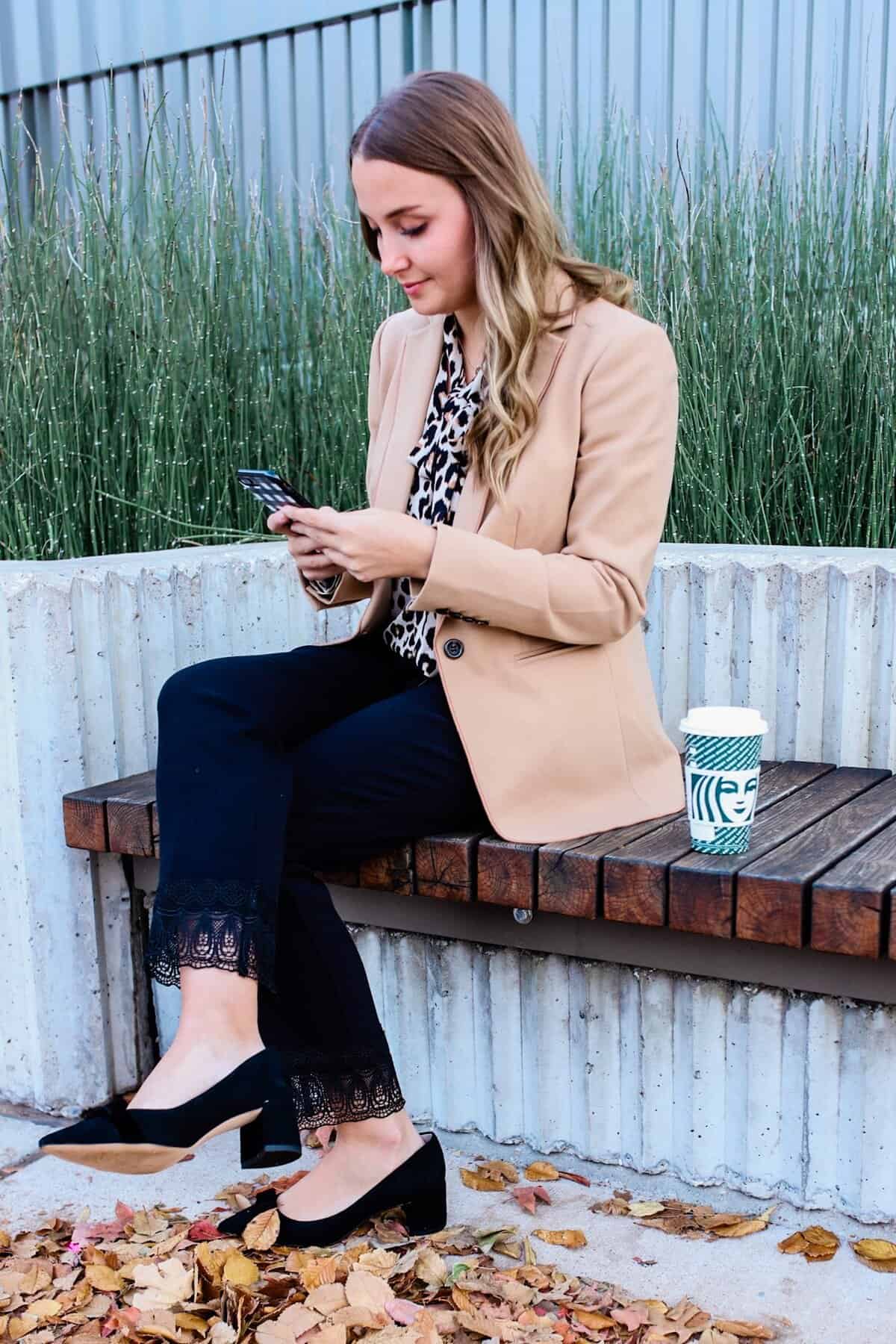 This ensemble perfectly balances professionalism with a touch of flair, making it an ideal choice for the fall office wardrobe. The camel-colored blazer adds a warm, autumnal tone while maintaining a polished look. Paired with a leopard print blouse, it introduces a subtle yet stylish pattern that livens up the outfit without being overpowering. The dark trousers with lace detailing at the hem offer an unexpected twist on classic work pants. Completed with black block-heel pumps, this outfit is both comfortable and chic, allowing for easy transition from desk to after-work drinks. The overall look exudes confidence and sophistication, sure to turn heads in any professional setting.