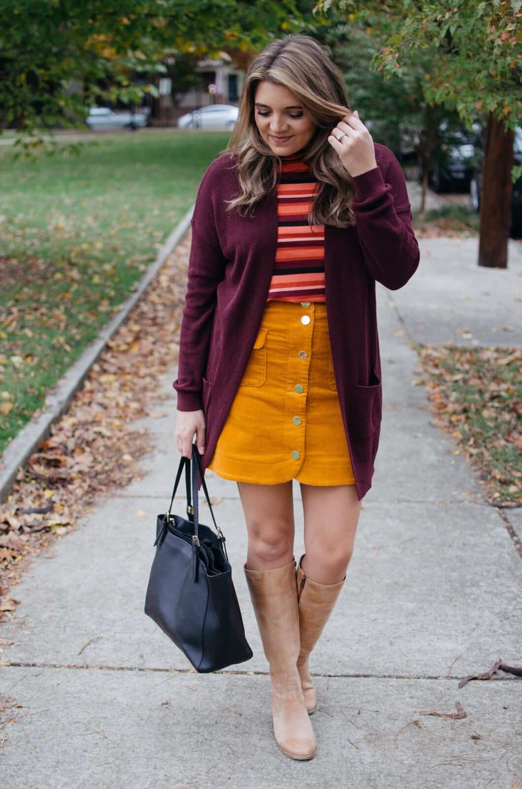 This ensemble masterfully combines warm fall colors to create a striking yet professional look. The burgundy cardigan layered over a striped orange top adds depth and visual interest, while the mustard corduroy skirt brings a pop of color and texture. Paired with tan knee-high boots and a sleek black tote, this outfit strikes the perfect balance between comfort and style. The mix of rich autumnal shades not only captures the essence of the season but also ensures you’ll stand out in the office for all the right reasons. This look demonstrates how to incorporate bold colors into your work wardrobe while maintaining a polished and put-together appearance.