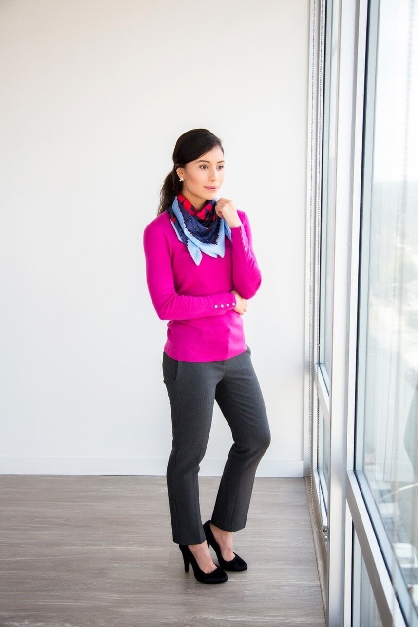 This ensemble perfectly captures the essence of chic fall workwear with a bold pop of color. The vibrant fuchsia sweater serves as the centerpiece, instantly brightening up any autumn day at the office. Paired with sleek charcoal trousers and classic black pumps, the outfit strikes an ideal balance between professional and stylish. The patterned scarf in shades of blue adds visual interest and a touch of sophistication, while also providing warmth for cooler days. This look demonstrates how a single statement piece can elevate a simple outfit, making it both eye-catching and office-appropriate. It’s a perfect example of how to incorporate fall colors into your work wardrobe without sacrificing professionalism or style.