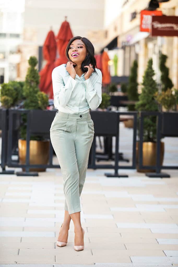 Embrace the unexpected this fall with a refreshing mint monochrome ensemble that’s both sophisticated and eye-catching. This outfit features a light mint button-down shirt paired seamlessly with high-waisted, cropped mint trousers, creating a streamlined silhouette that’s perfect for the office. The monochromatic look elongates the figure while the soft, cool hue adds a breath of fresh air to typical autumnal palettes. Nude pumps complement the outfit without competing for attention, making this a versatile choice for various work settings. The polished yet playful vibe of this ensemble proves that fall work wear doesn’t have to be limited to dark, heavy tones – it can be light, bright, and utterly chic.