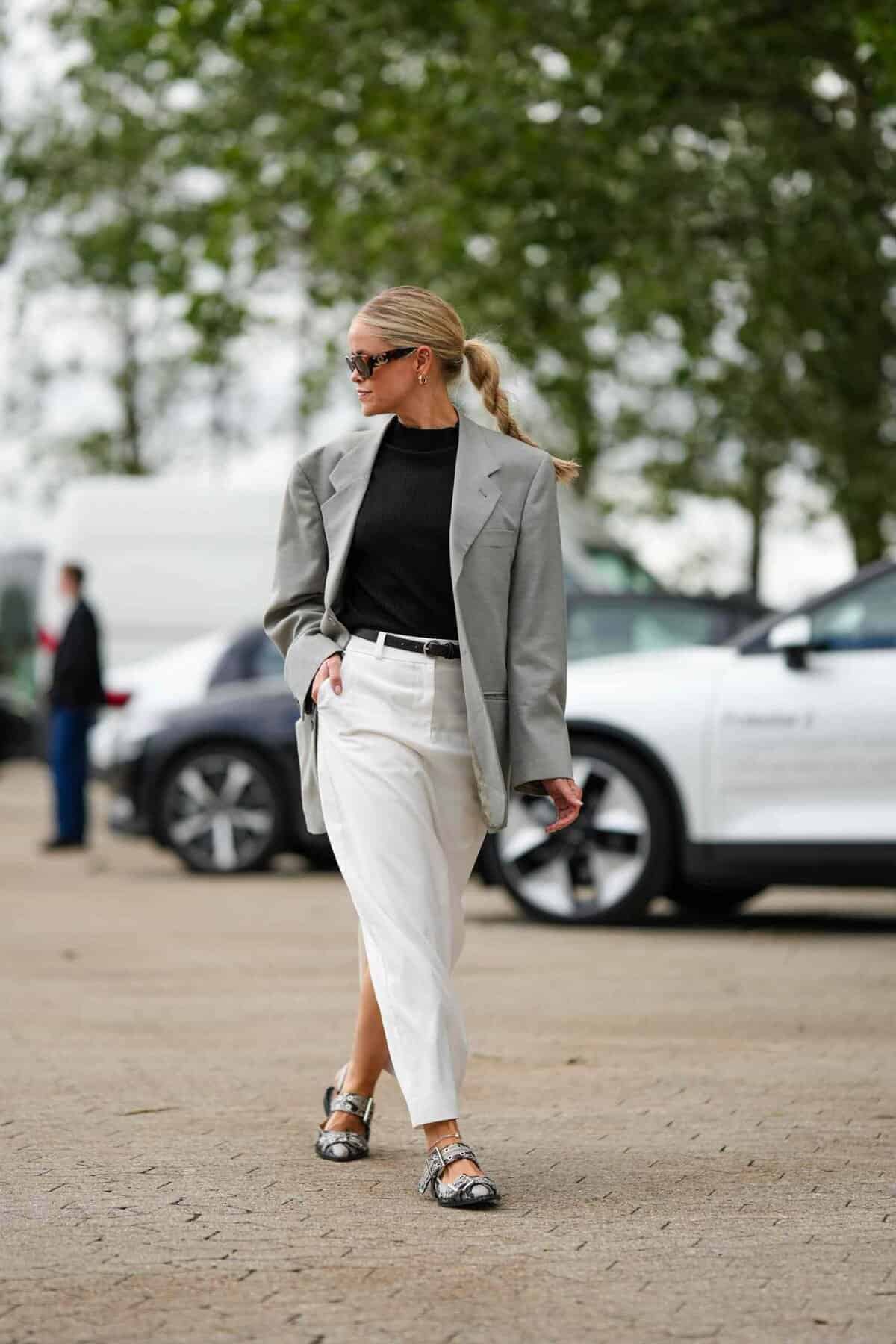 This ensemble epitomizes fall’s sophisticated yet relaxed office style. The oversized gray blazer adds a touch of masculine chic, while the crisp white trousers create a striking contrast that’s perfect for the transitional season. A black turtleneck underneath keeps the look sleek and warm. The outfit is expertly balanced with statement snakeskin flats, adding an unexpected twist to the classic silhouette. Topped off with sleek sunglasses and a polished ponytail, this look seamlessly blends comfort and professionalism. It’s an ideal choice for those cooler autumn days when you want to make a stylish impression without sacrificing comfort in the workplace.